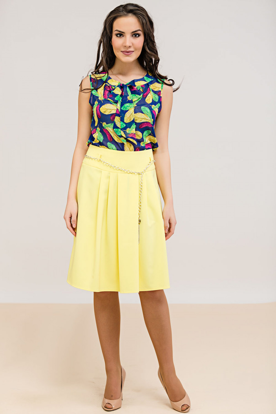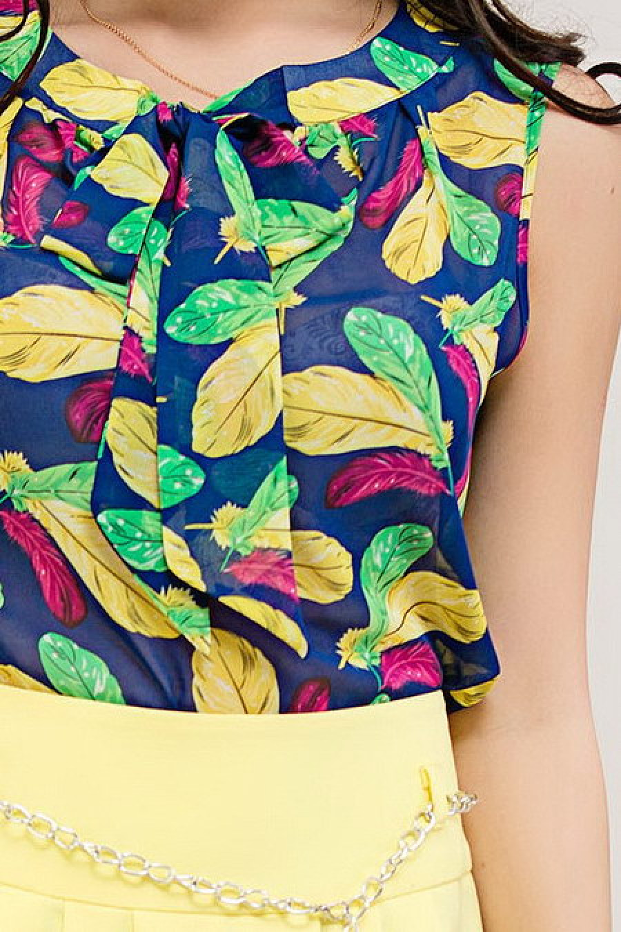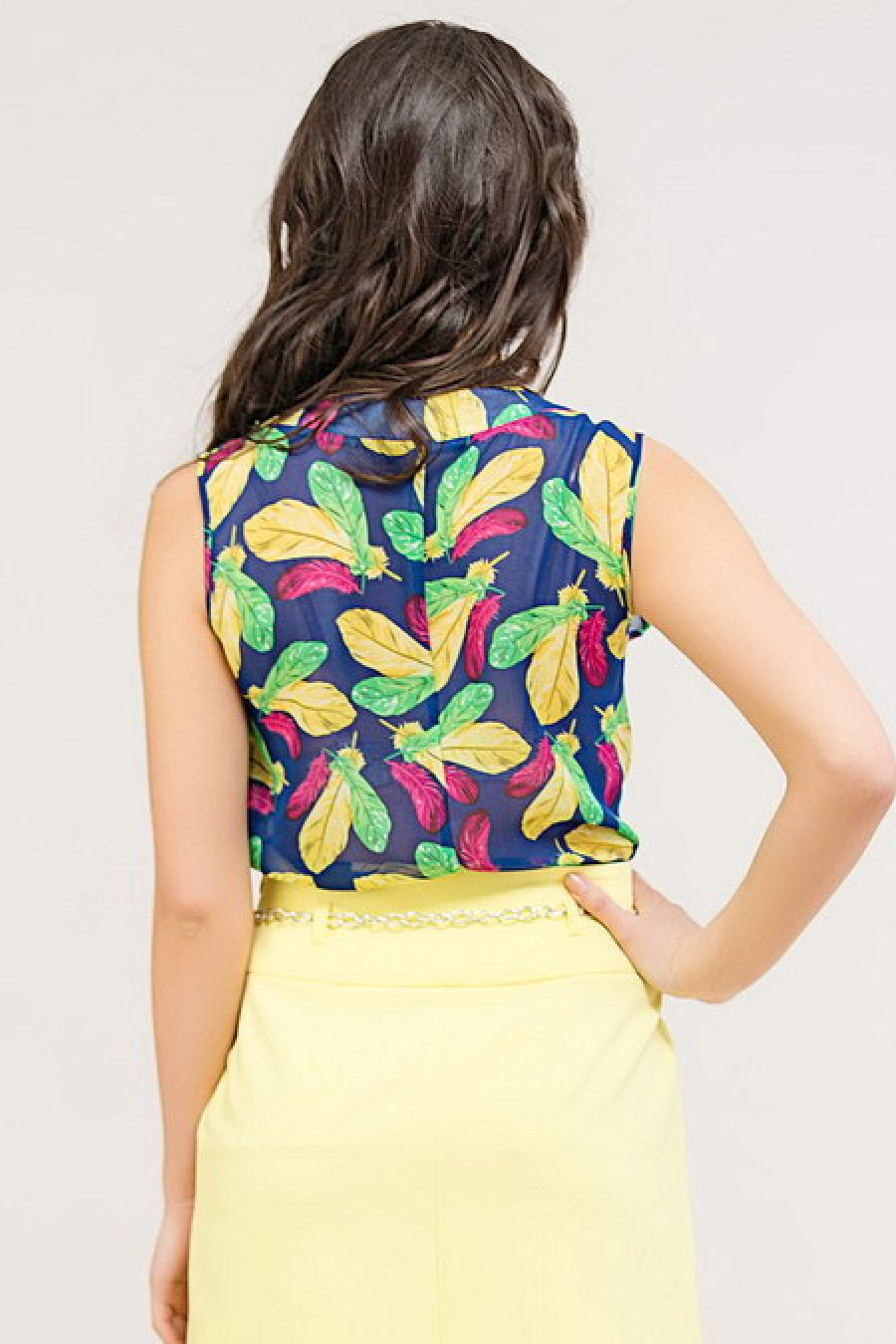 Оригинальная блуза с принтом "перо" подойдет как для повседневной носки, так и для более торжественных случаев. Присборена у горловины, украшена бантом. Без рукавов.