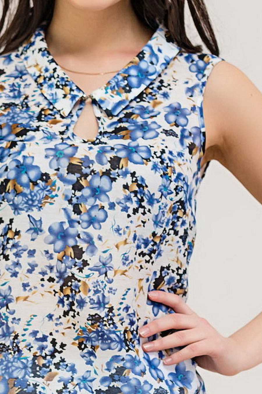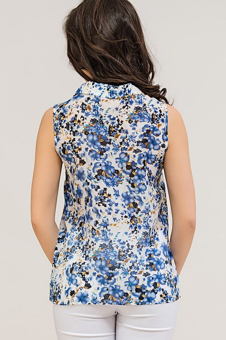 Свободного покроя модная блуза из легкой ткани с отложным воротником. Вид застежки - на пуговицах. Длина изделия по спинке: 63 см. Без рукава.