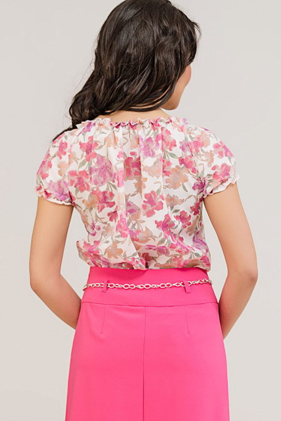Оригинальная блуза с цветочным принтом подойдет как для повседневной носки, так и для более торжественных случаев. Присборена в районе горла, короткие рукава.
