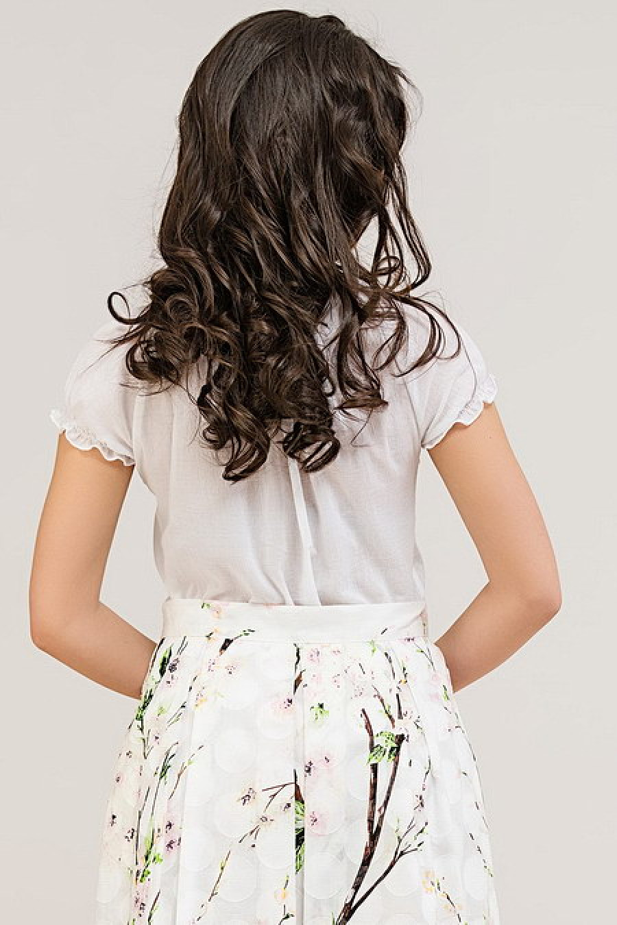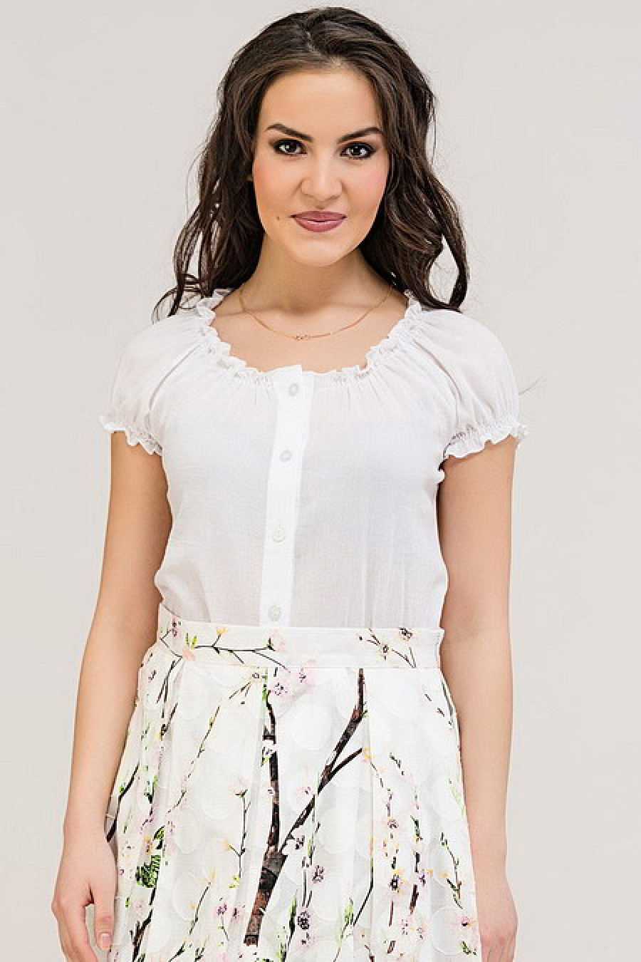 Романтическая блуза, присборенная в районе горловины. Имеет рукава-фонарики, застегивается на пуговицы.
