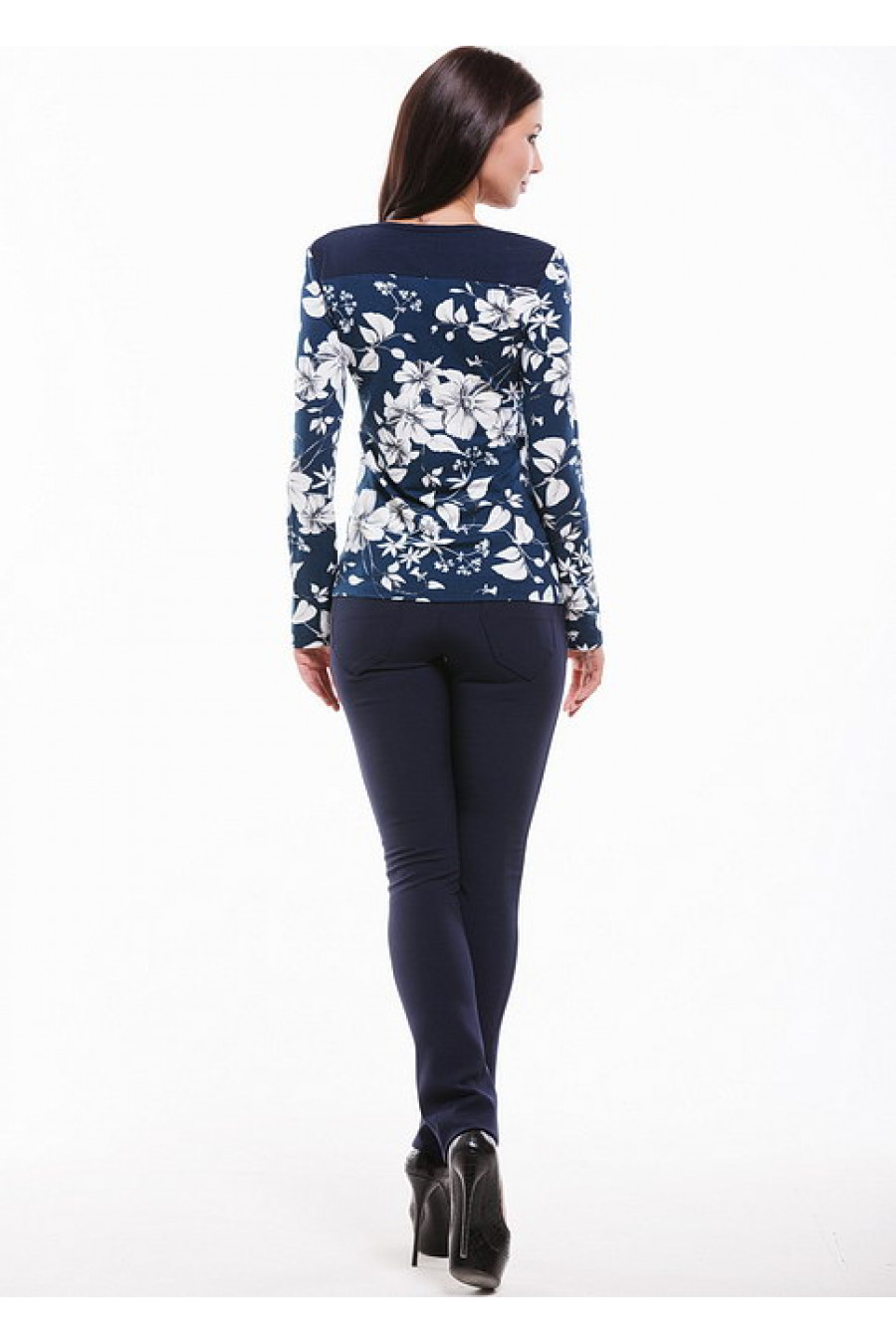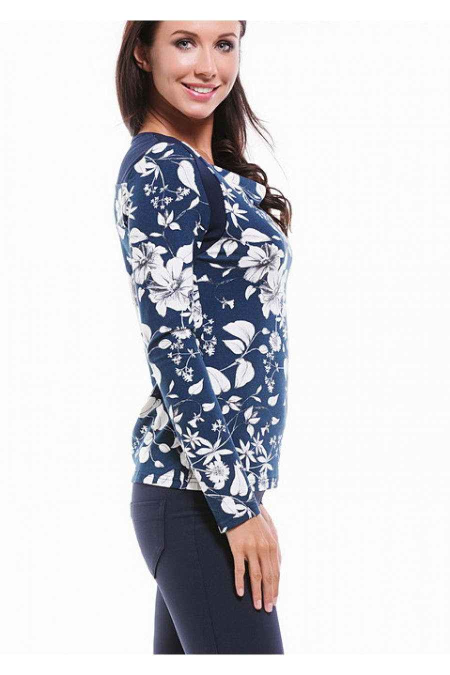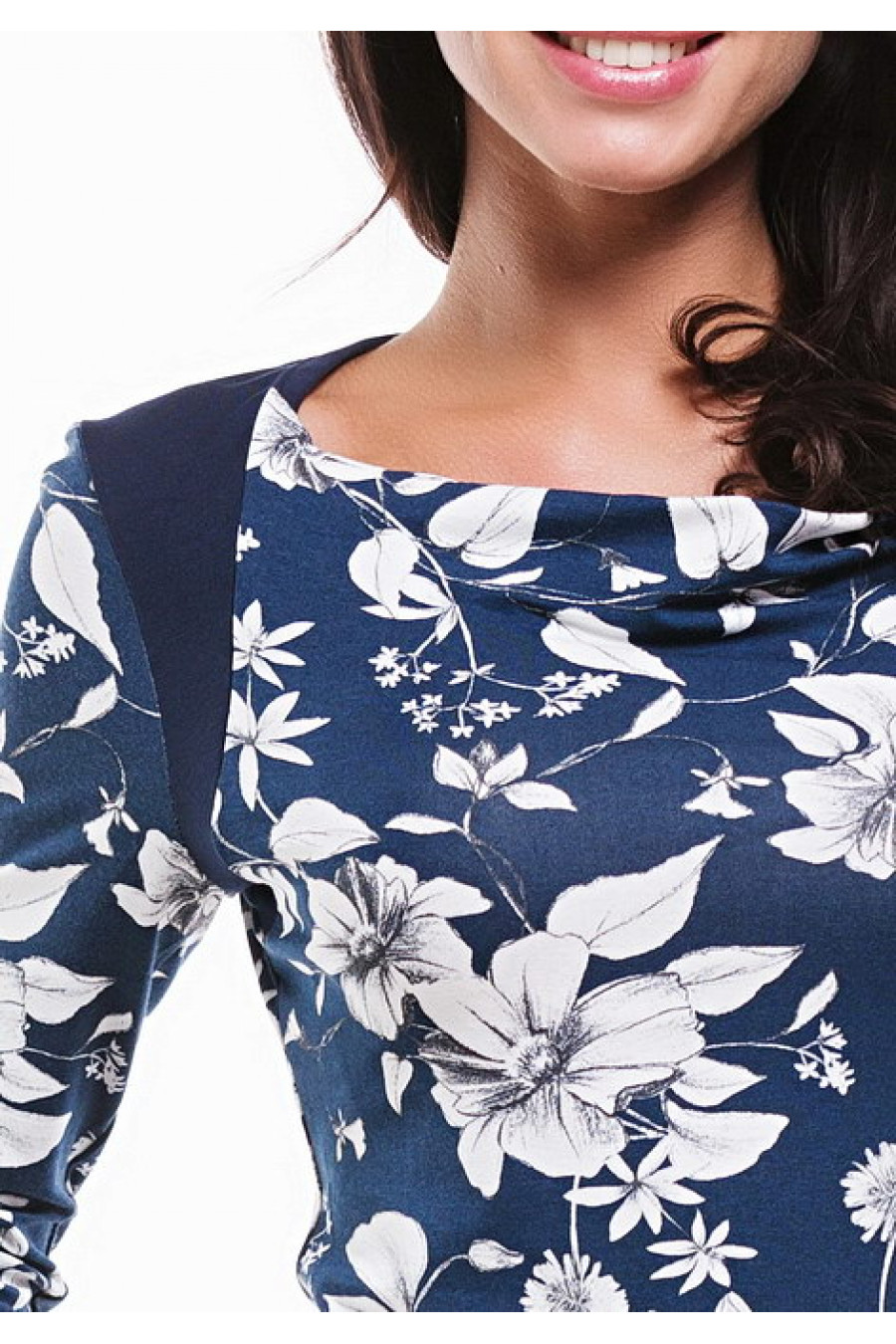 Блуза с цветочным орнаментом и воротником-лодочкой.