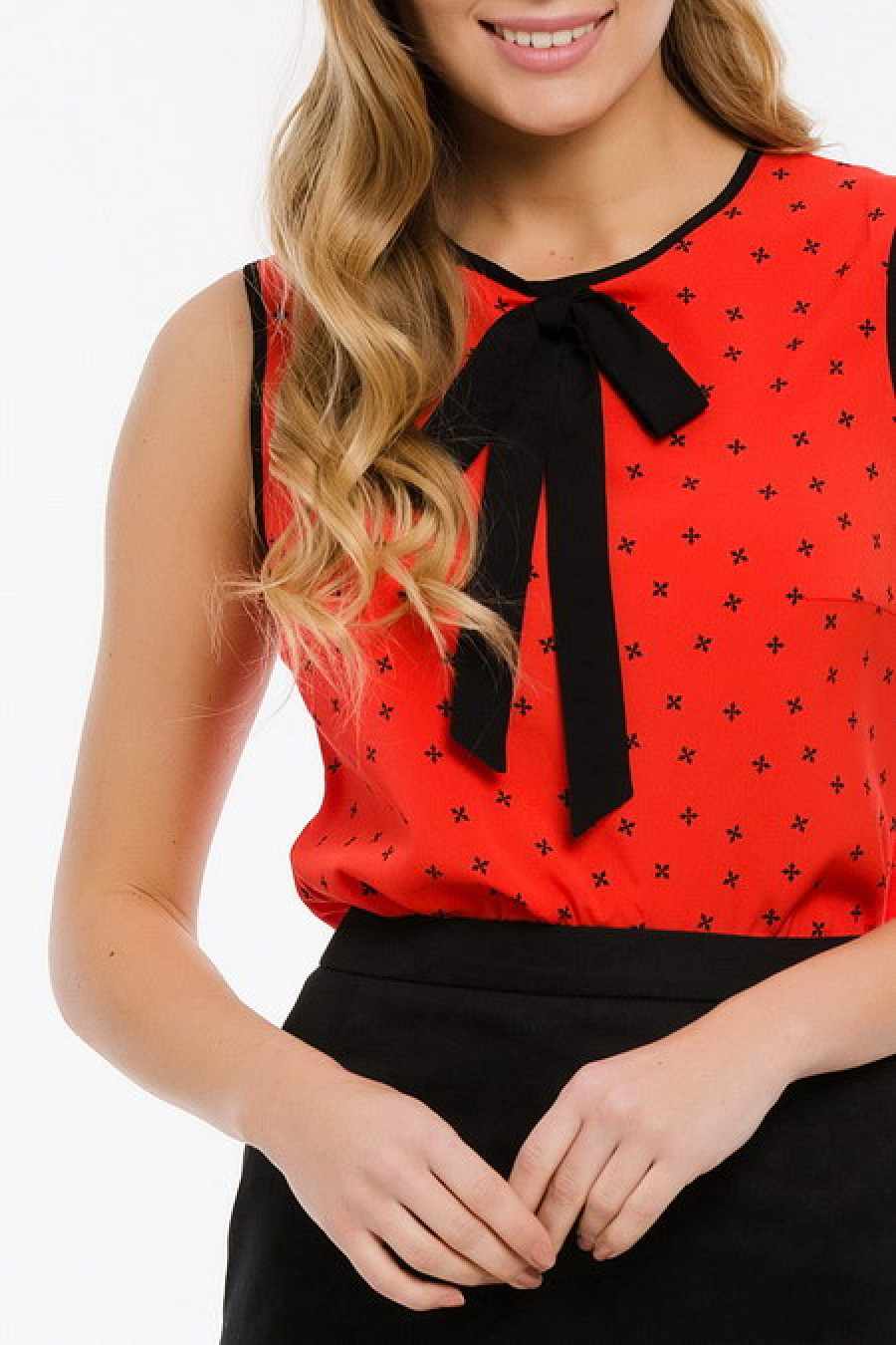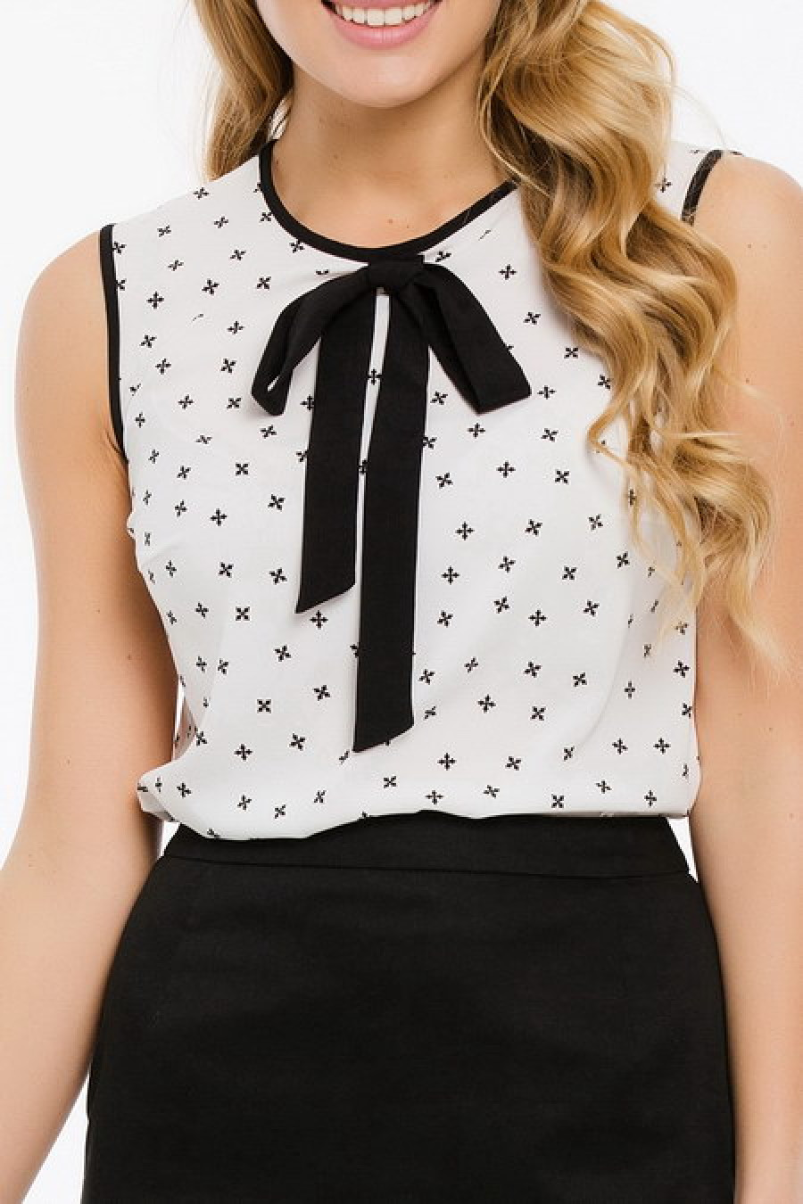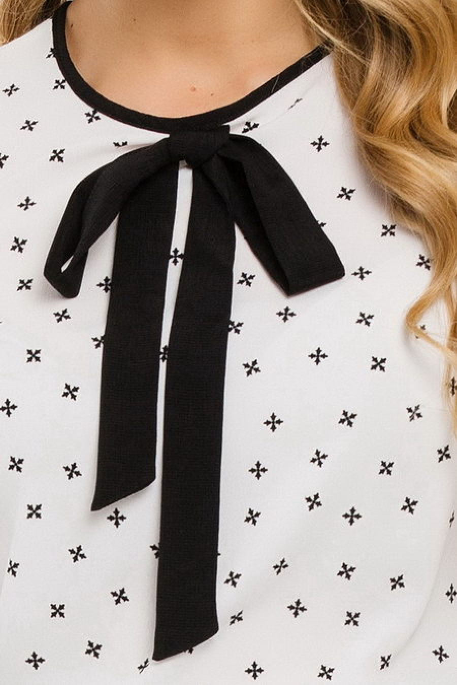 Элегантная блуза, декорированная контрастным бантом, станет отличным элементом делового гардероба.