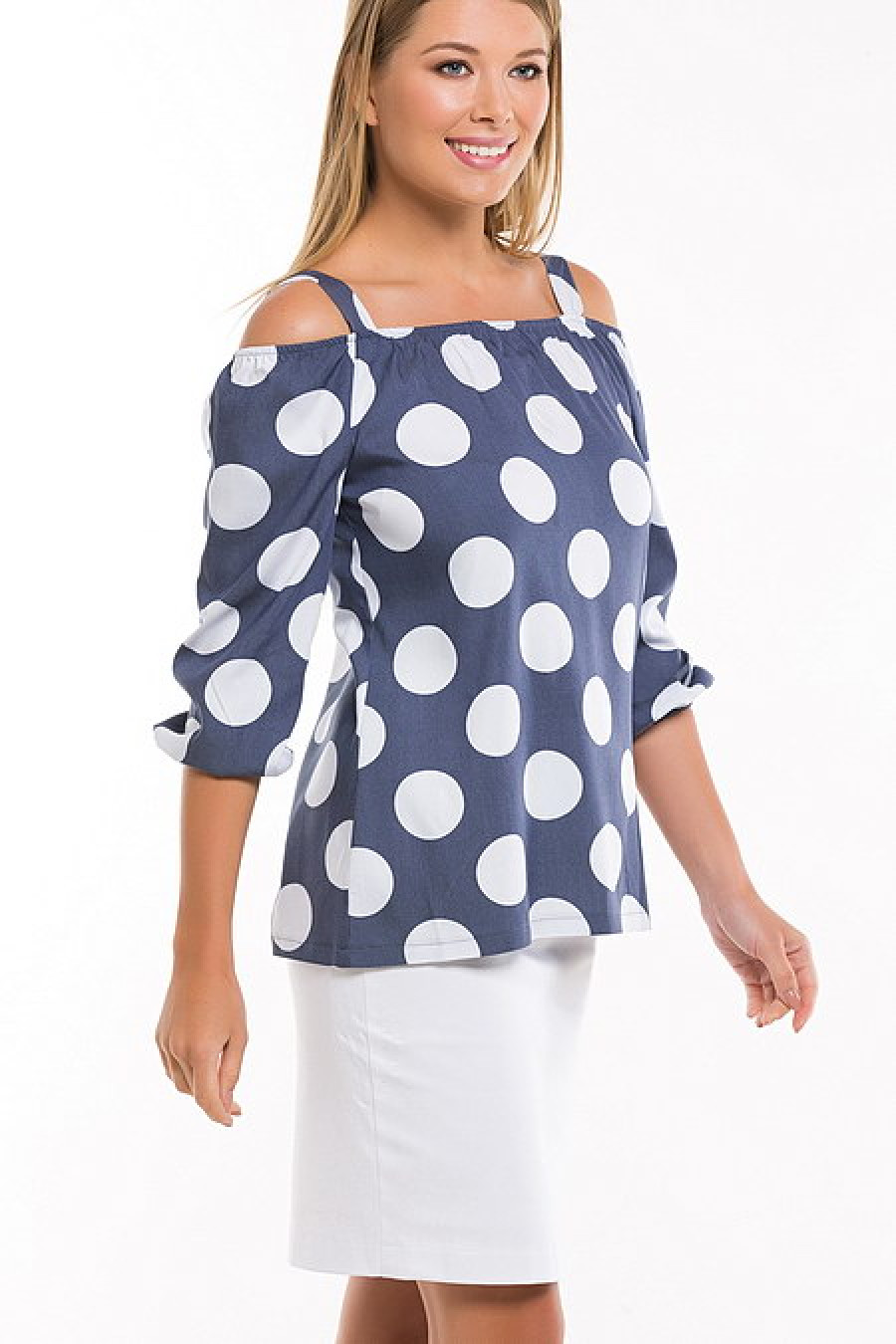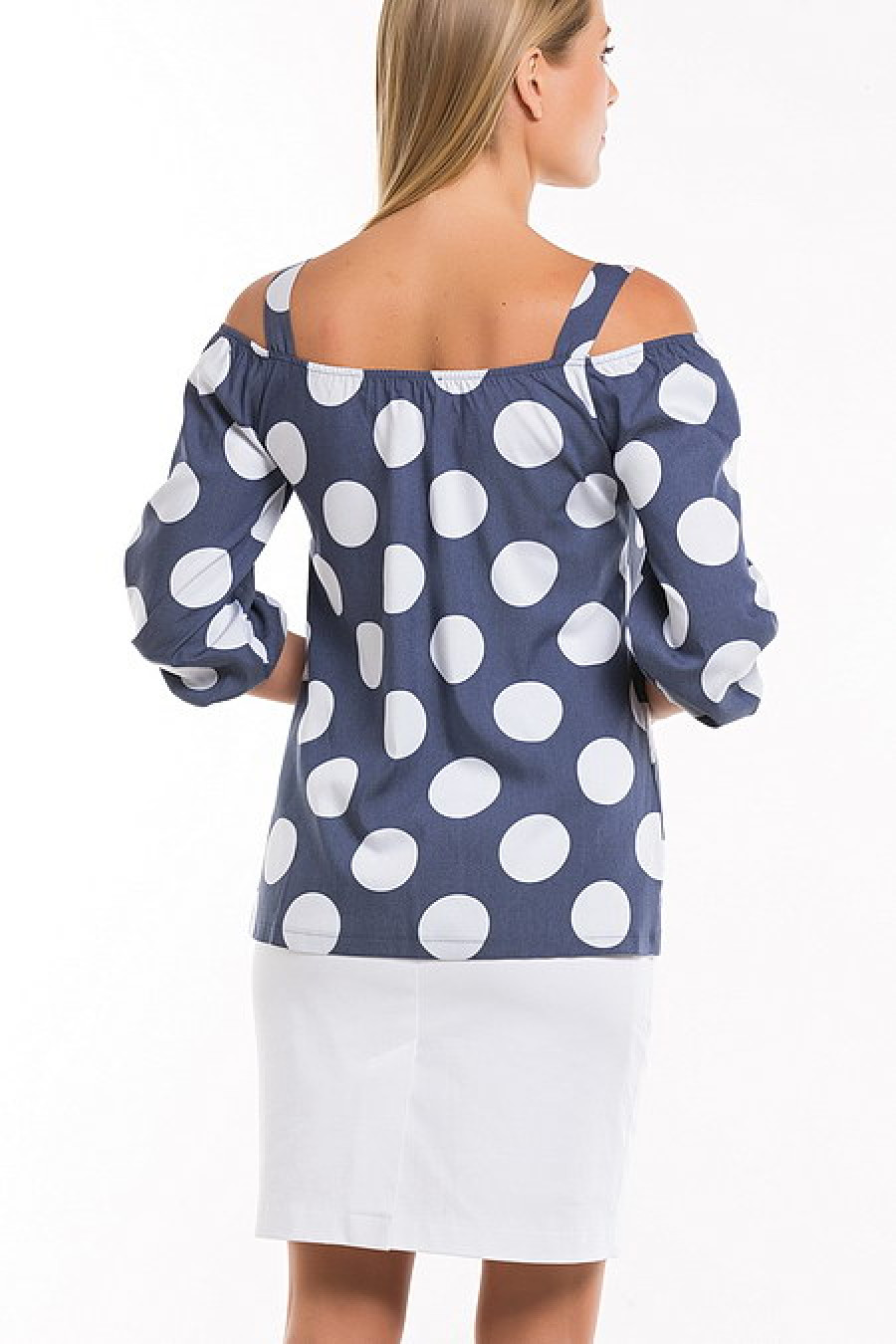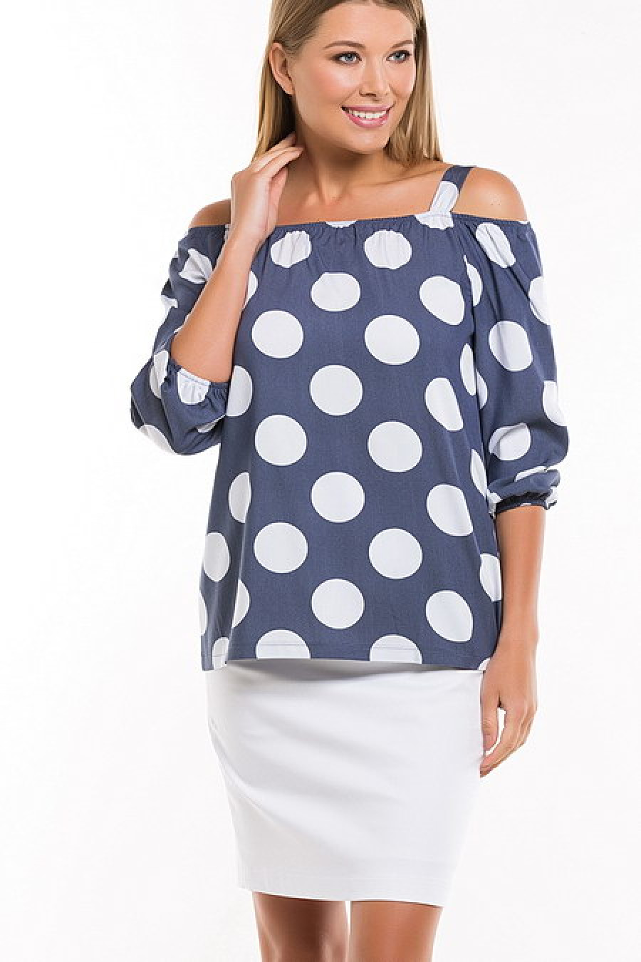Повседневна стильная блуза в крупный горох. Интересный дизайн рукава- комбинация из бретелей и присборенного рукава чуть ниже локтя.