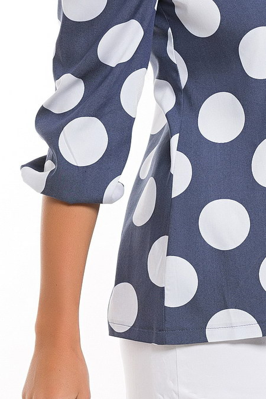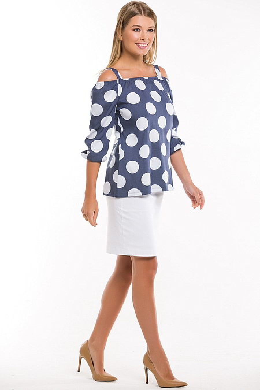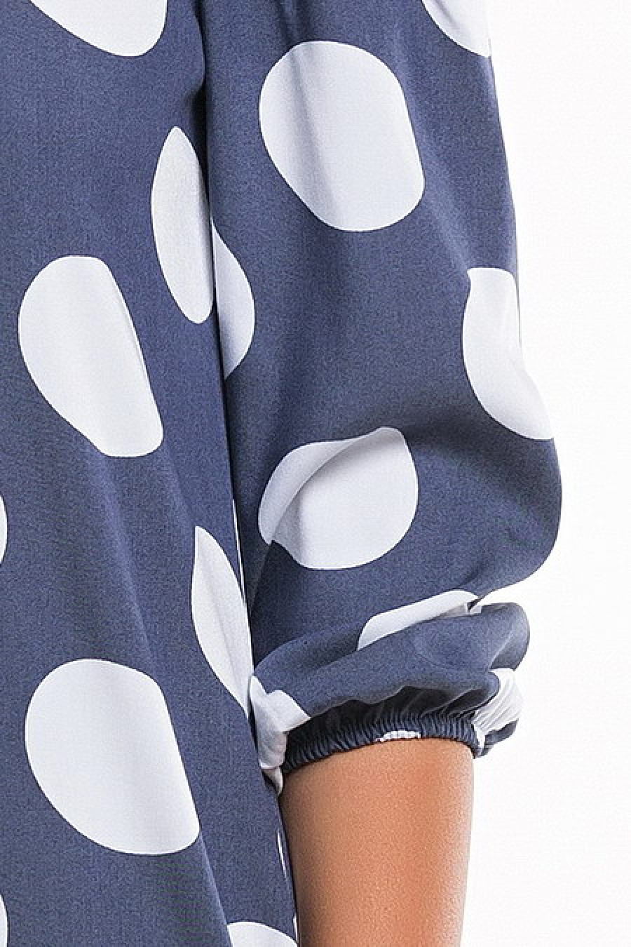 Повседневна стильная блуза в крупный горох. Интересный дизайн рукава- комбинация из бретелей и присборенного рукава чуть ниже локтя.