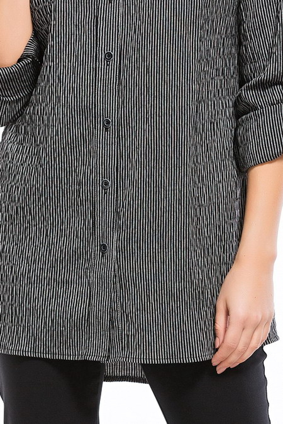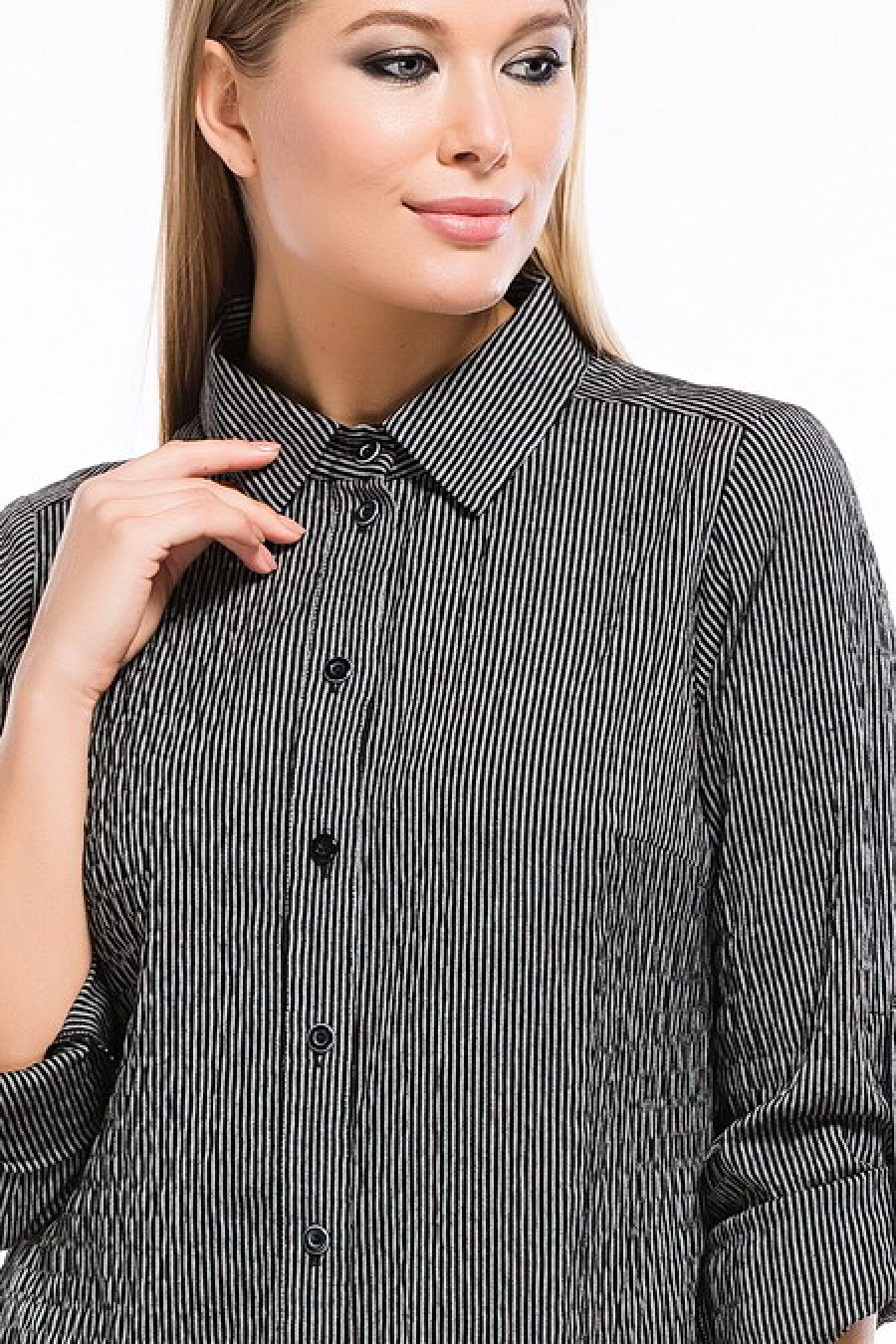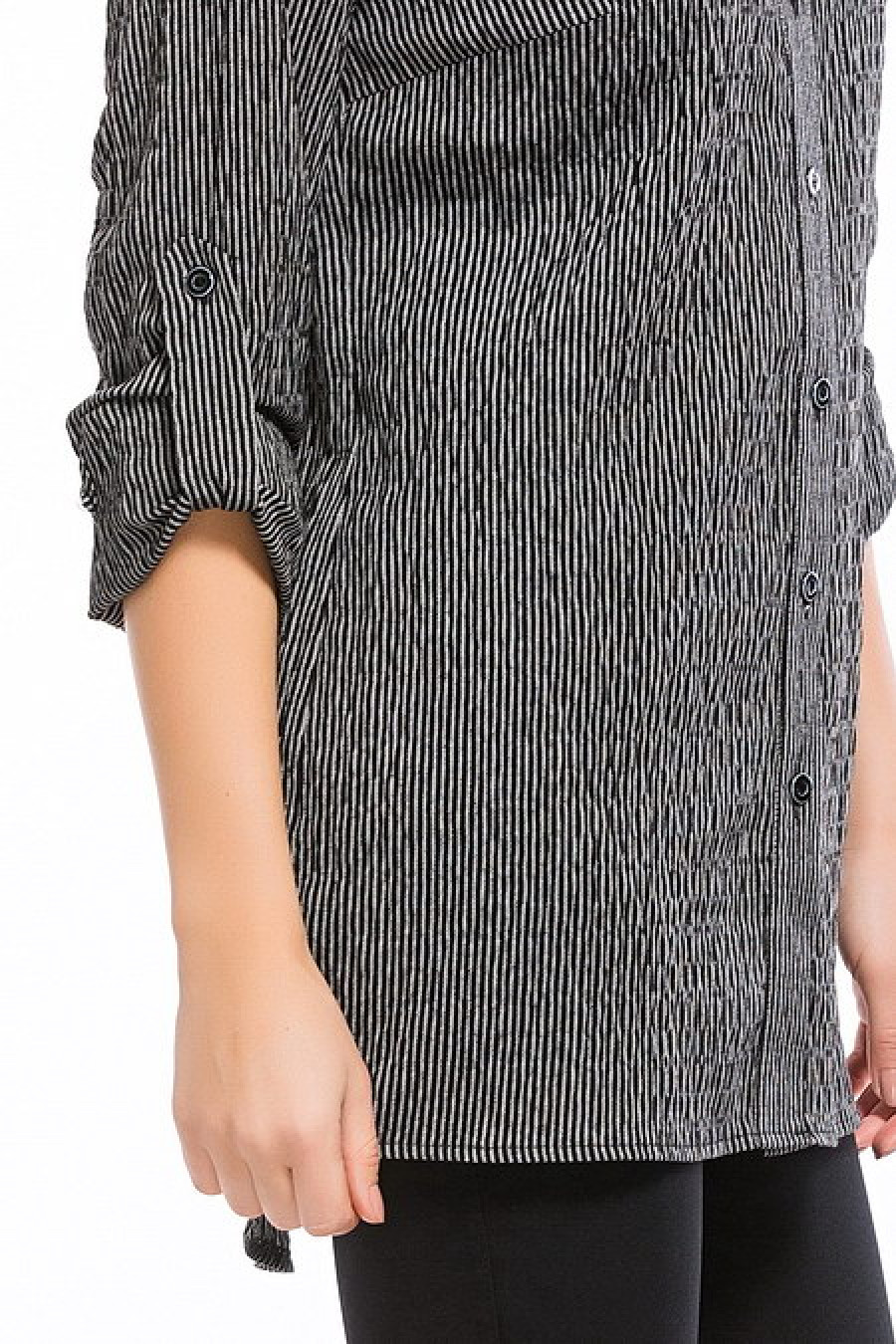 Рубашка на пуговицах с асимметричным подолом. Рукав можно подвернуть до длины 3/4 и зафиксировать предусмотренной для этого пуговицей. Воротник- стойка.