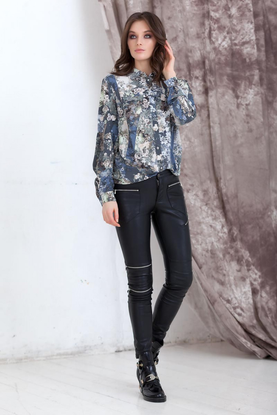 Элегантная блузка из струящейся ткани с изящным принтом. Модель полуприлегающего силуэта с длинным рукавом на манжете, дополнена шарфом, который можно завязать в виде банта на шее или поясом на талии. Рубашечный воротник. Впереди застежка на пуговицы.