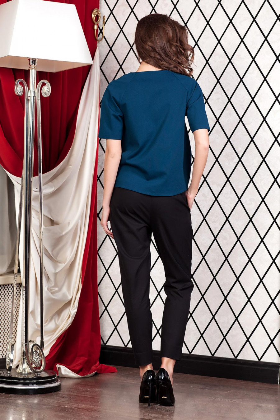 Объемная блуза из плотного трикотажного полотна с коротким рукавом-реглан. По низу перед короче задней части.