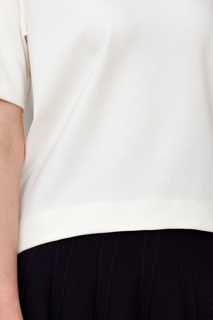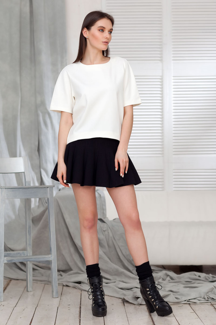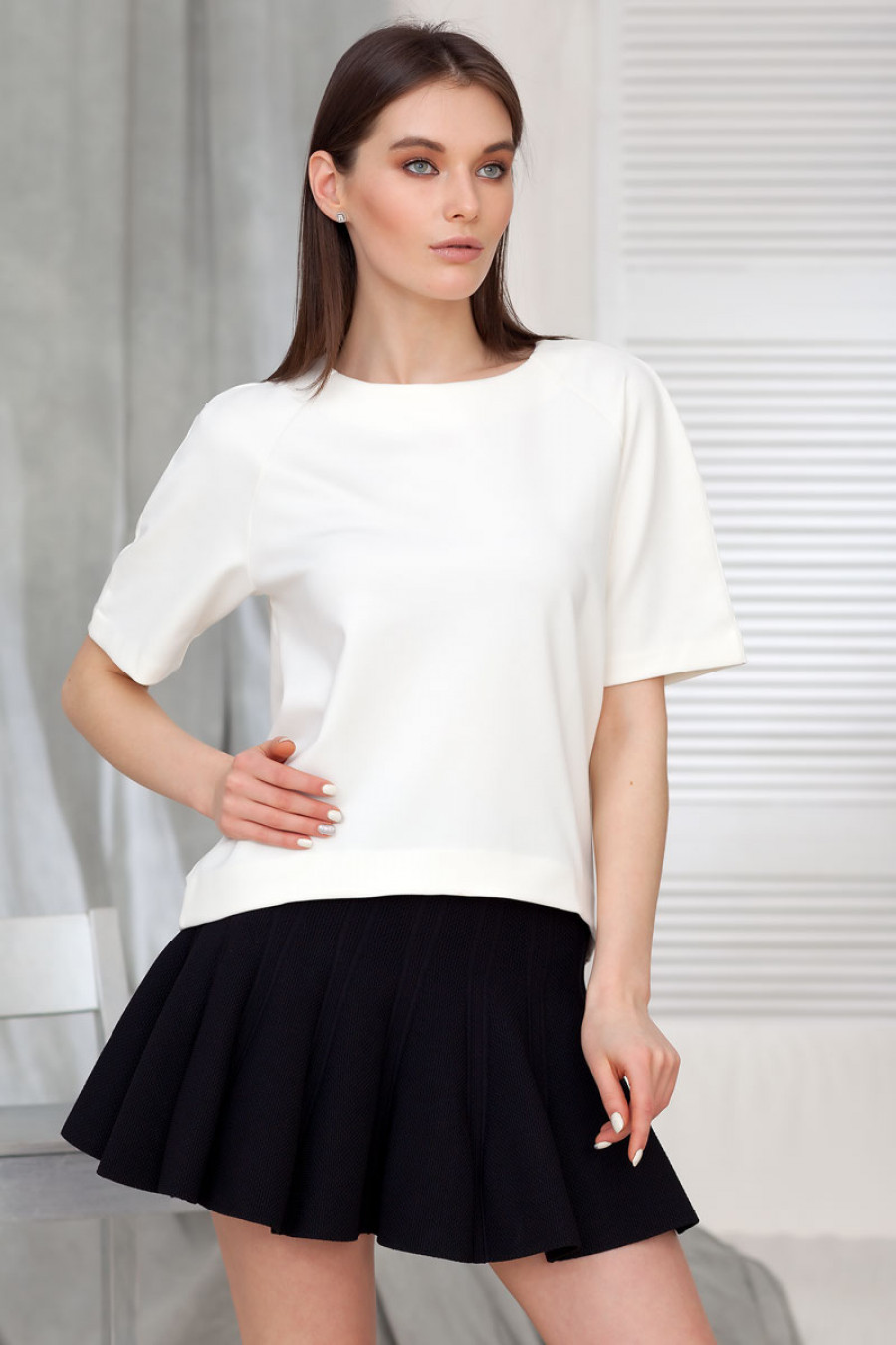 Объемная блуза из плотного трикотажного полотна с коротким рукавом-реглан. Низ изделия выполнен с удлинением спинки. Модель прекрасно сочетается с различными видами брюк и юбок.