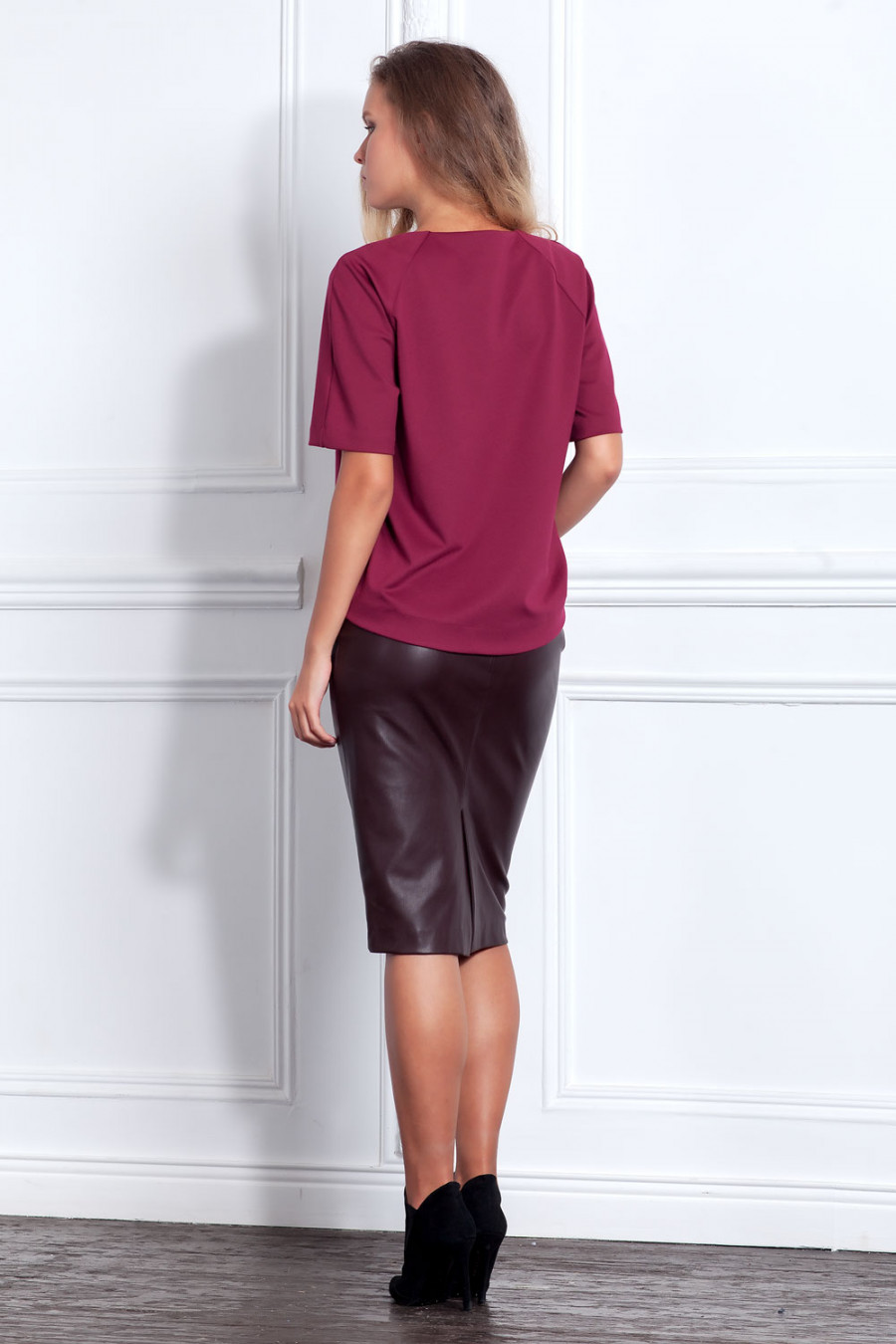 Объемная блуза из плотного трикотажного полотна с коротким рукавом-реглан. Низ изделия выполнен с удлинением спинки. Модель прекрасно сочетается с различными видами брюк и юбок.