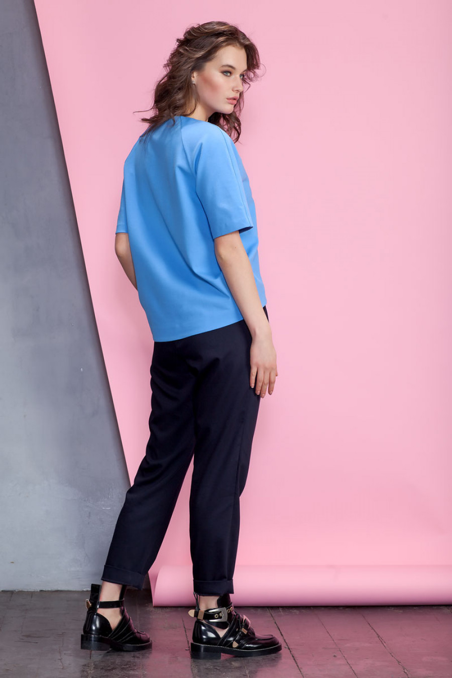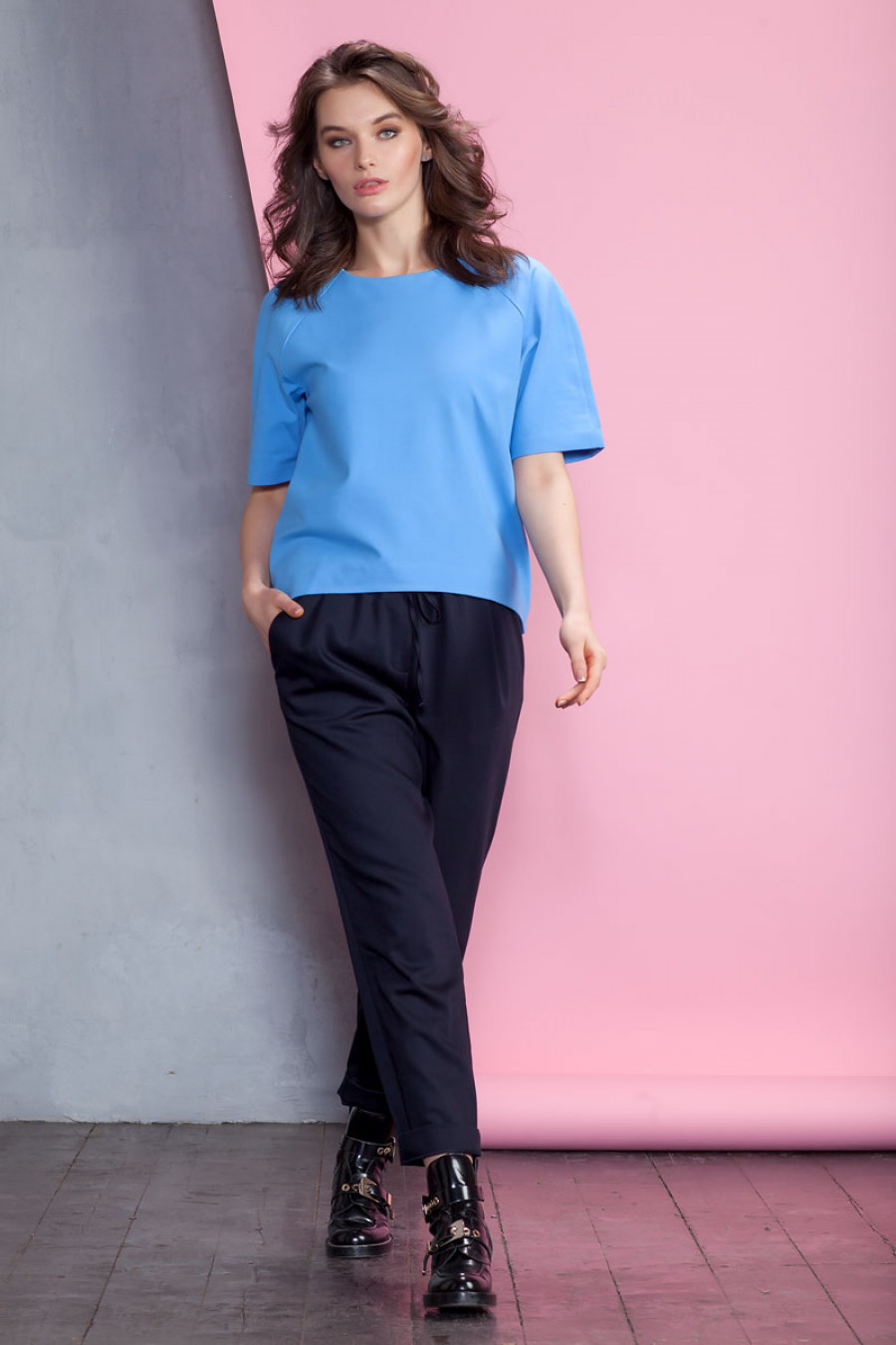 Оригинальная блуза из плотного джерси. Модель объемного кроя с коротким рукавом реглан. Низ изделия выполнен с удлинением по спинке. Модель прекрасно сочетается с разными видами одежды.