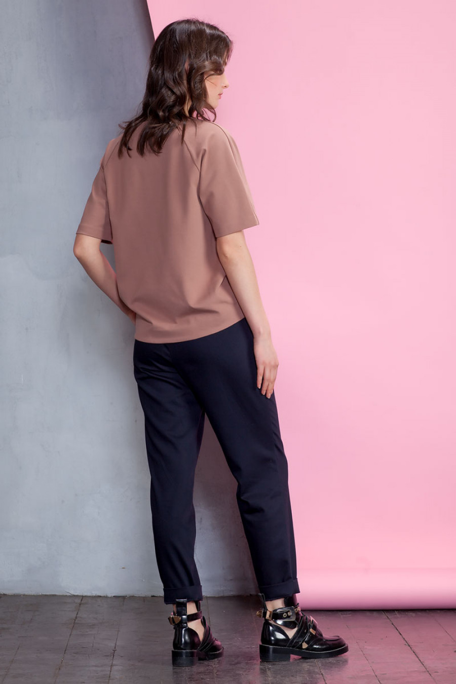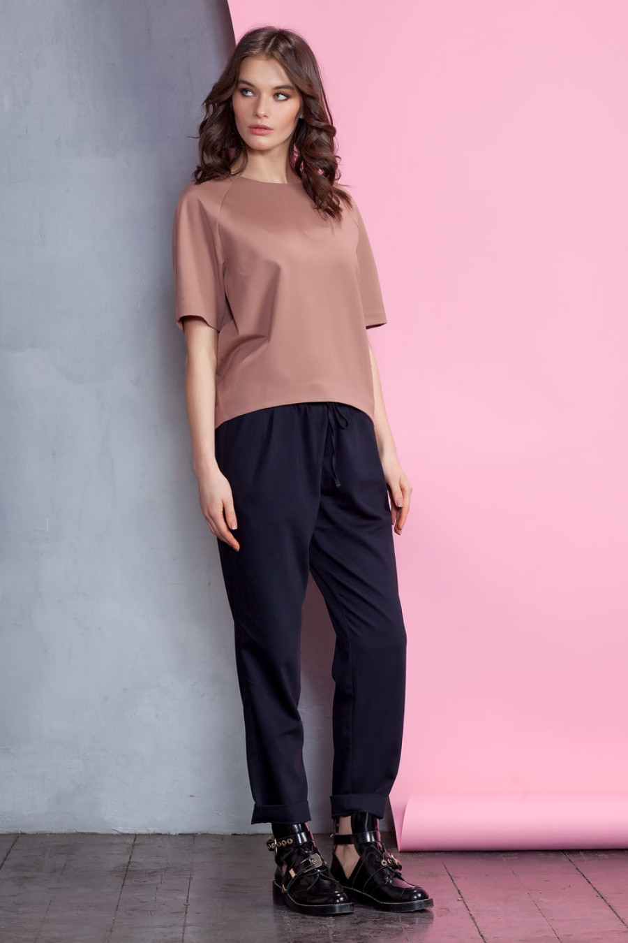 Оригинальная блуза из плотного джерси. Модель объемного кроя с коротким рукавом реглан. Низ изделия выполнен с удлинением по спинке. Модель прекрасно сочетается с разными видами одежды.