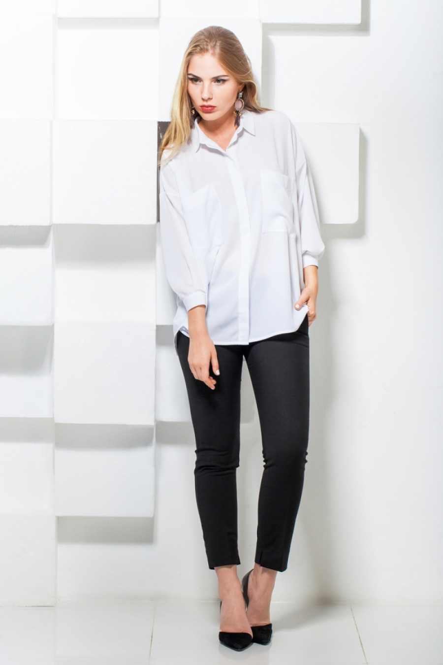 Модная блузка объемного кроя из легкой блузочной ткани. Модель с широкими рукавами на манжете. Впереди накладные карманы. Блузка с потайной застежкой на пуговицы.