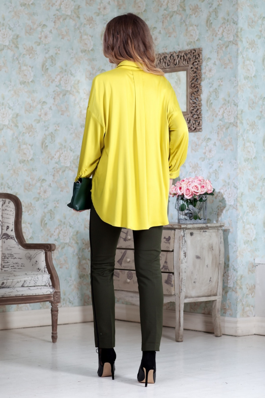 Модная блузка объемного кроя из легкой ткани. Модель с широкими рукавами на манжете. Впереди блузка декорирована настрочными клапанами на уровне груди. Застежка потайная на пуговицы.