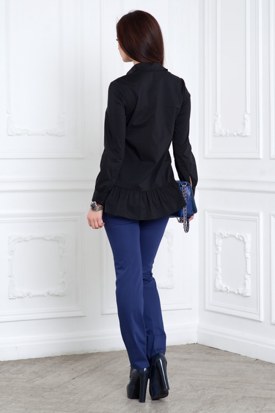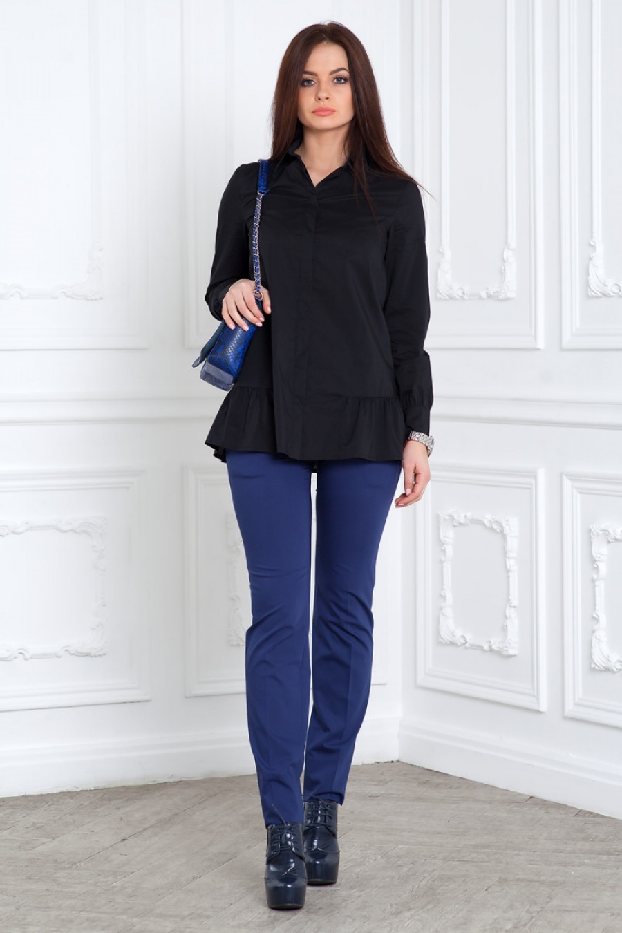 Блузка хлопковая прямая с баской. Длинный рукав на манжете. Впереди потайная застежка на пуговицы.