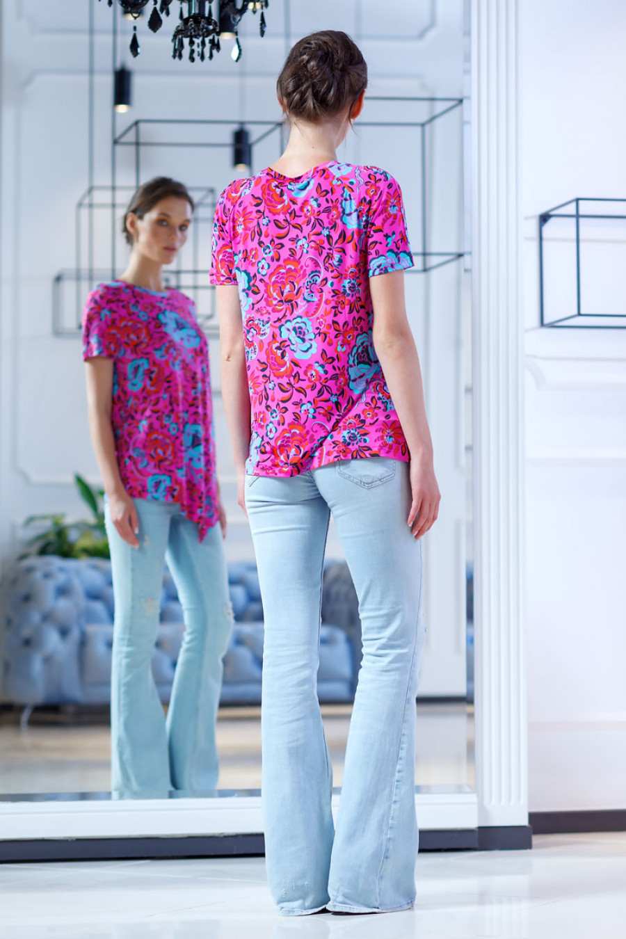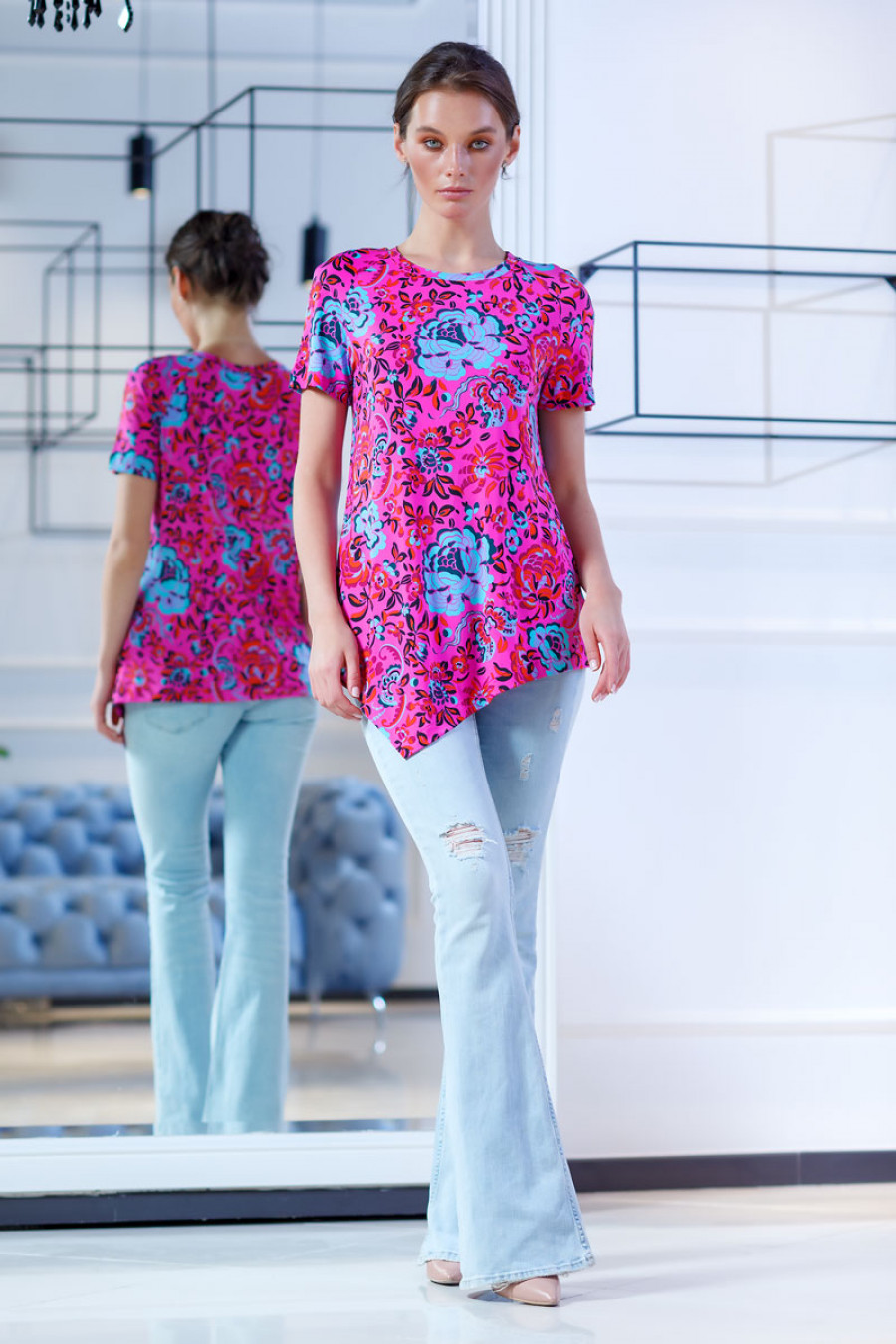 Стильная блуза из принтованного струящегося трикотажа с коротким рукавом реглан. Модель свободного покроя с асимметричной линией низа переда. Округлый вырез горловины обработан планкой.
