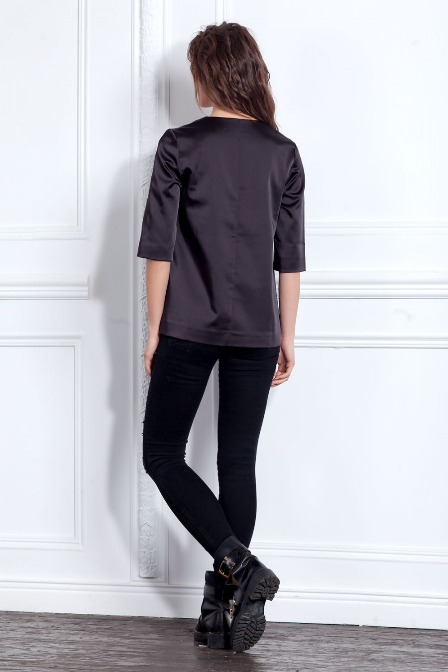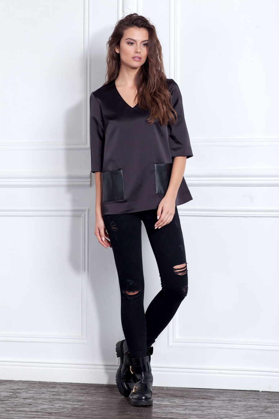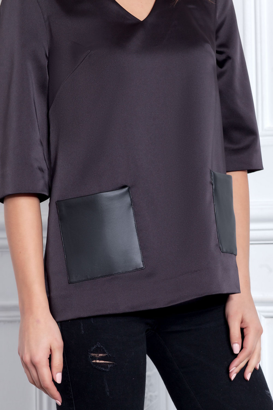 Женственная блуза из плотного атласа с рукавом до локтя и глубоким V образным вырезом горловины. Модель свободного кроя с кожаными карманами.