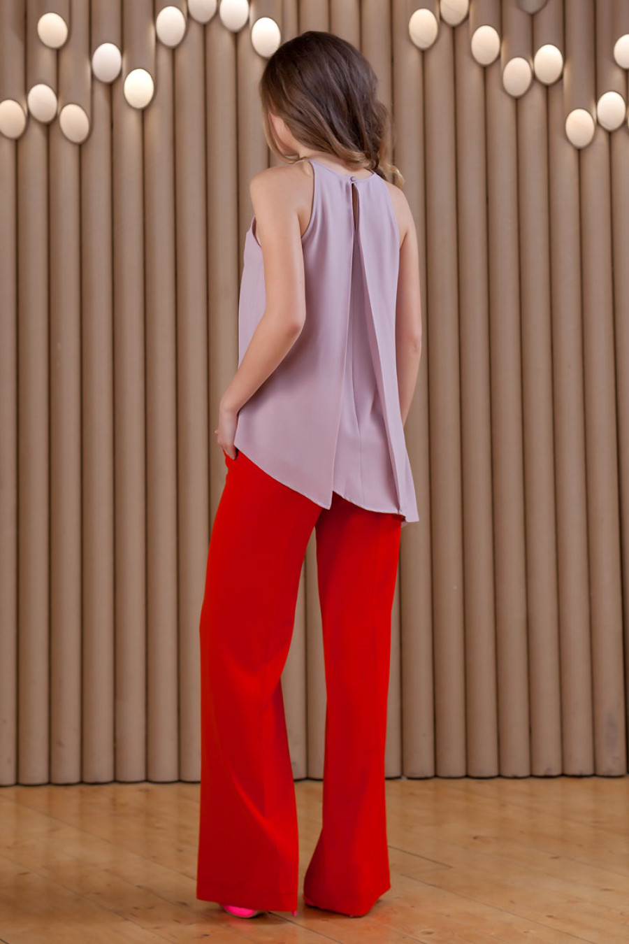 Стильная блузка без рукава прямого силуэта. Модель с округлым вырезом горловины. Блузка декорирована отлетной спинкой. Асимметричный низ придает изделию особый шарм. Блузка прекрасно сочетатаеться с брюками, юбкой.