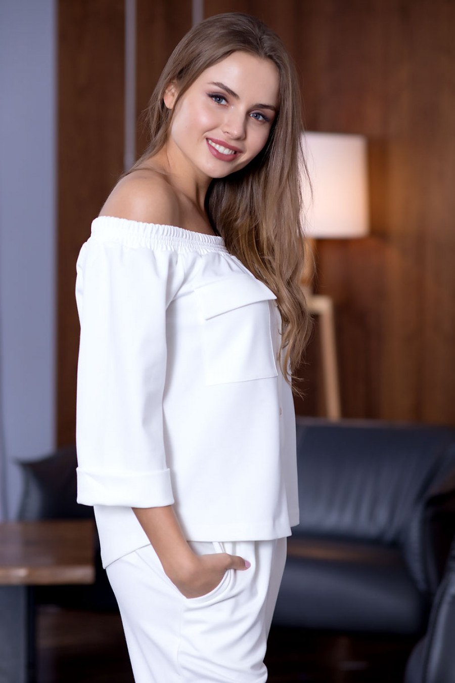 Эффектная и стильная блуза со "спущенными" плечами из джерси. Широкий рукав 3/4 с манжетой по низу. Спереди выполнены накладные карманы и имитация застежки на пуговицы.