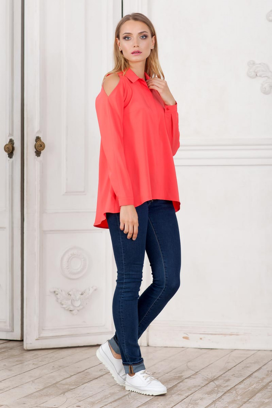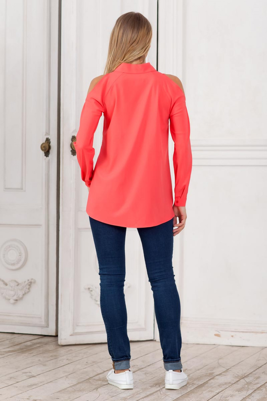 Элегантная и стильная блузка из приятной блузочной ткани. Модель силуэта клеш с удлинением по спинке. Длинный рукав реглан с открытыми плечами. Горловина оформлена отложным воротником. Впереди потайная застежка на пуговицы.