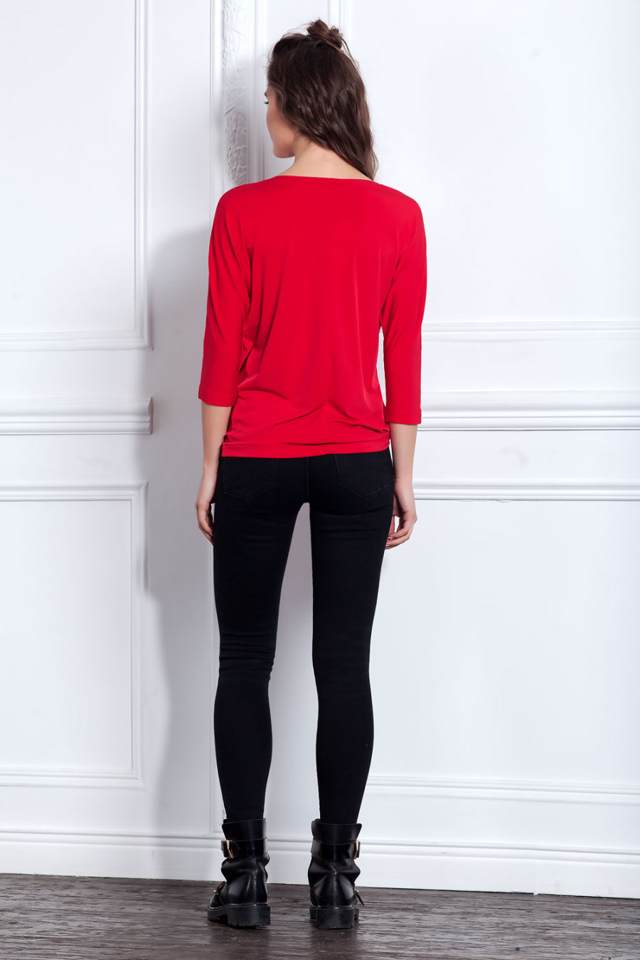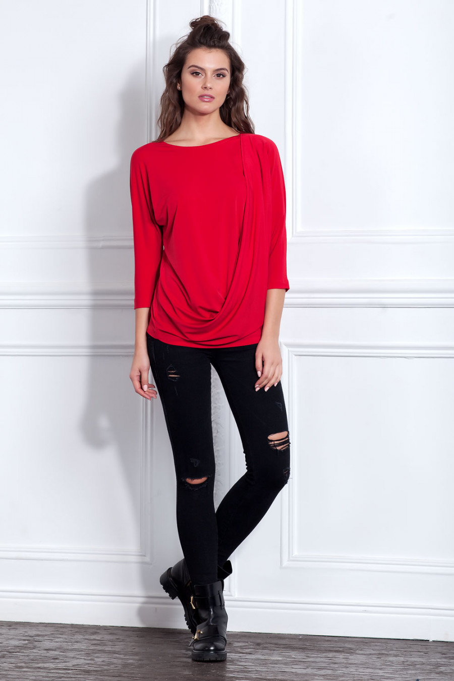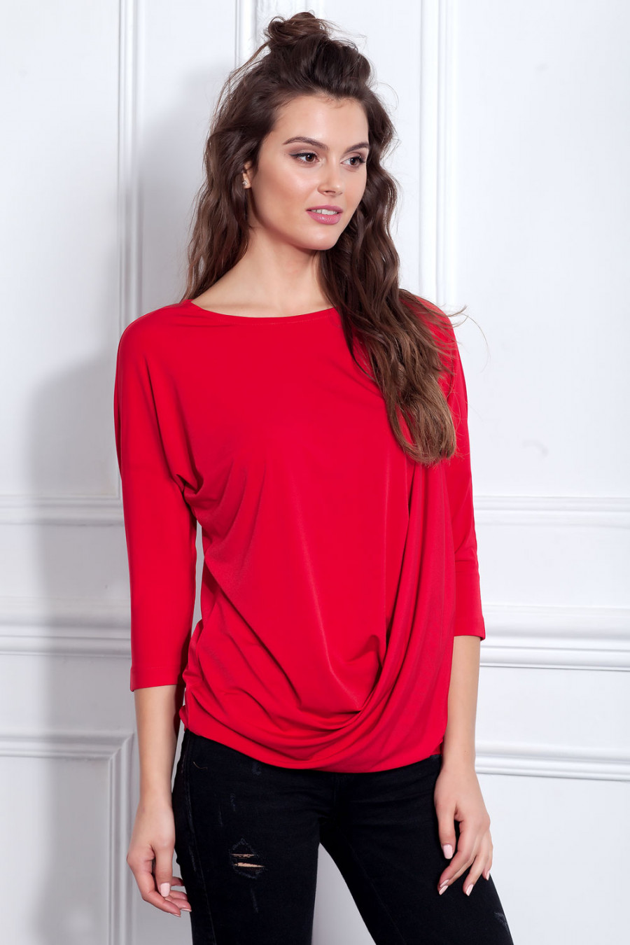 Стильная трикотажная блуза с рукавом 3/4. Модель объемного кроя с оригинальной складкой впереди. Блуза прекрасно сочетается с различными видами одежды.