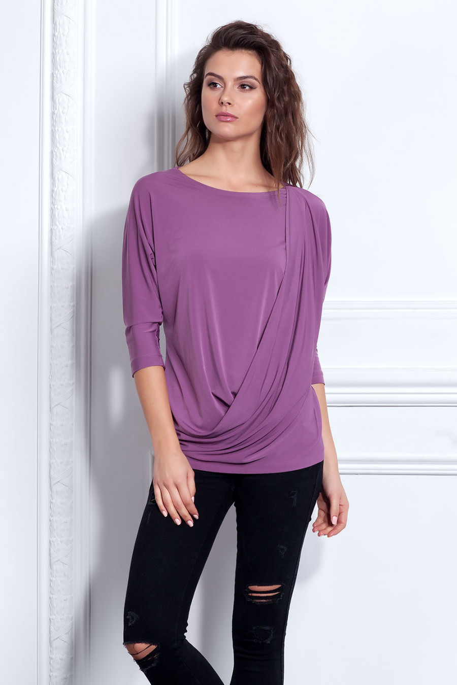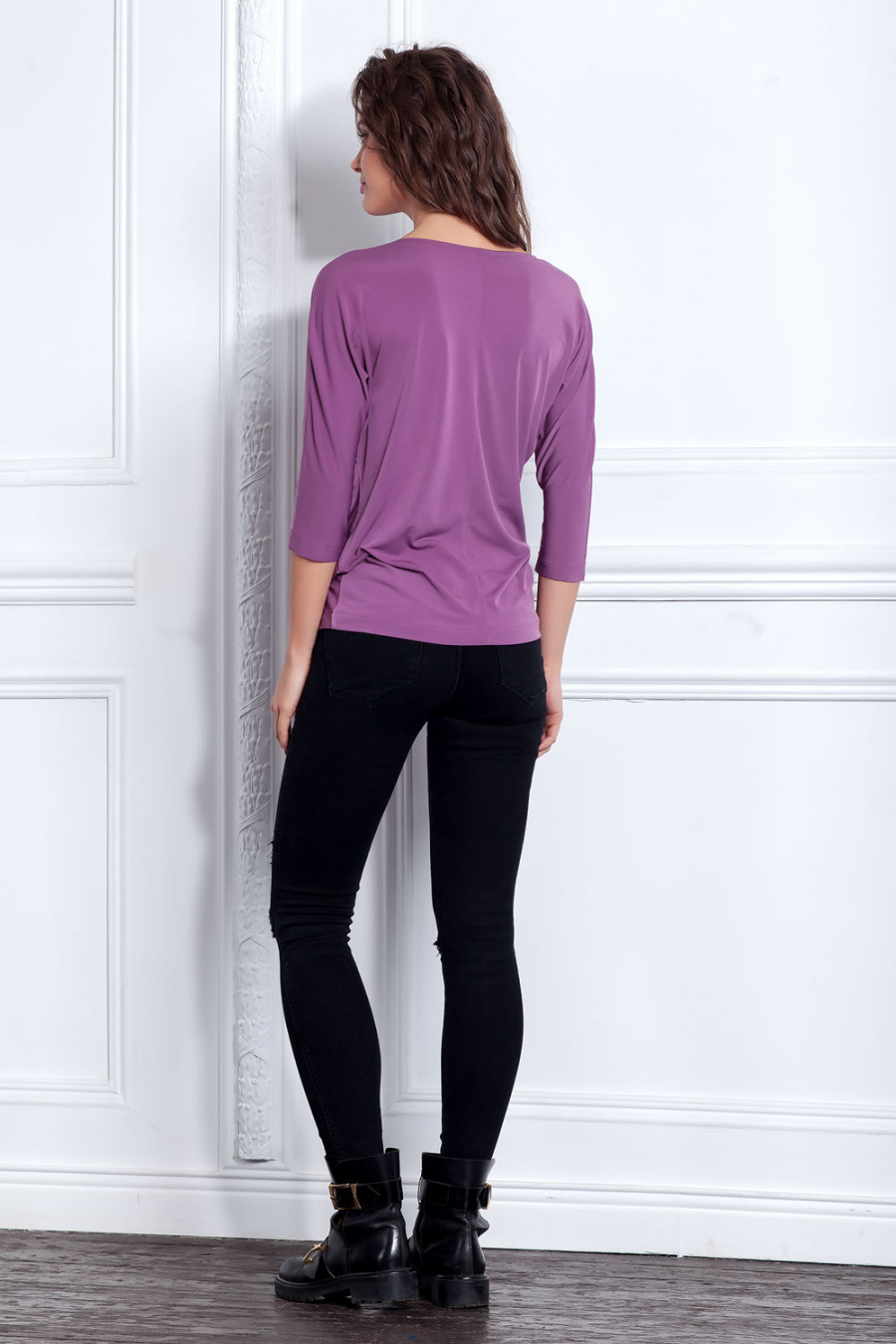 Стильная трикотажная блуза с рукавом 3/4. Модель объемного кроя с оригинальной складкой впереди. Блуза прекрасно сочетается с различными видами одежды.