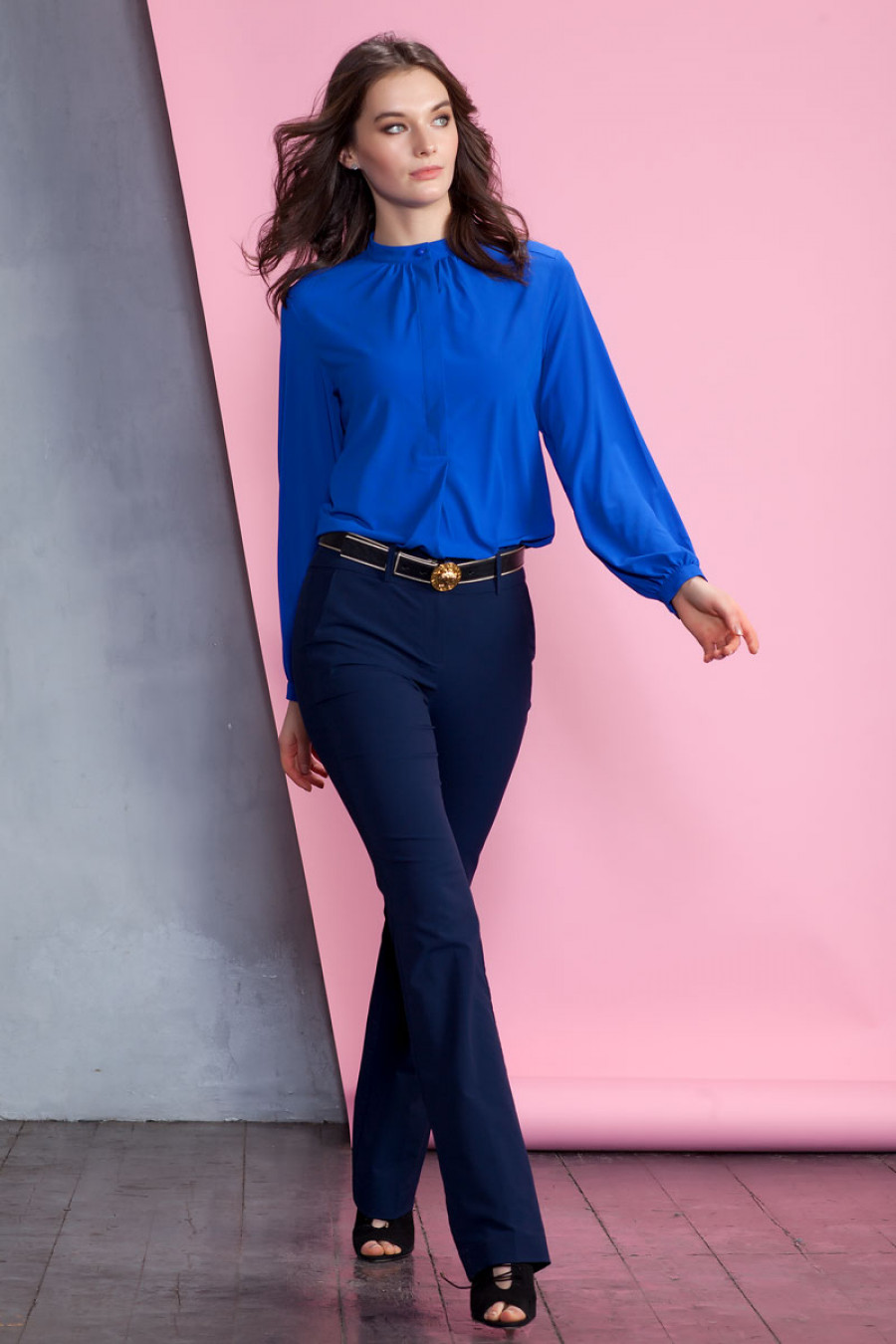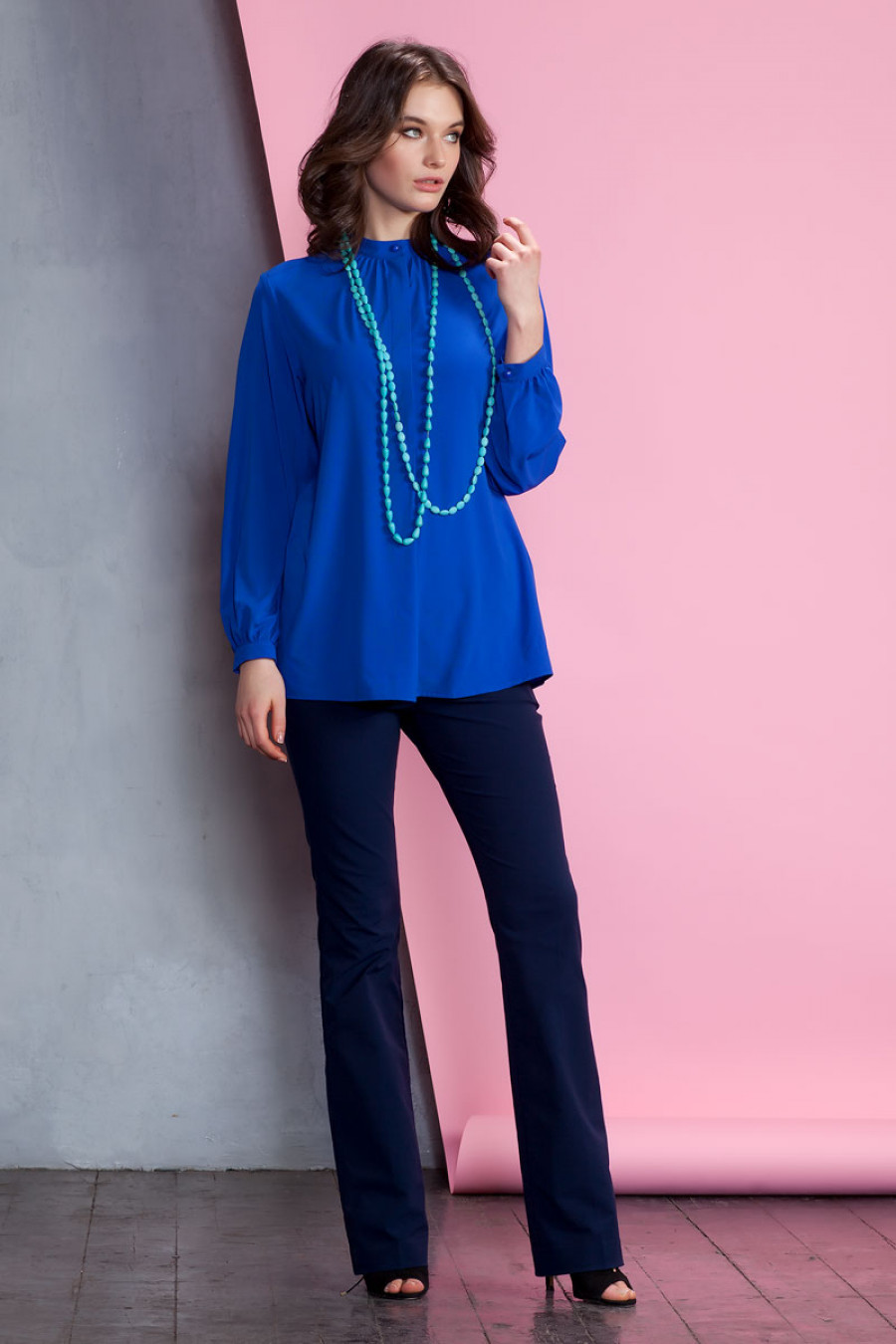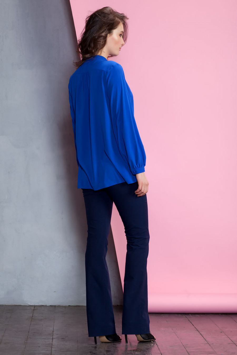 Элегантная блузка из слегка прозрачного однотонного шифона. Модель свободного кроя с длинным рукавом на манжете. Впереди потайная застежка на пуговицы. Она отлично подойдет как для офисных комплектов с классическими брюками, так и для casual-варианта с джинсами.
