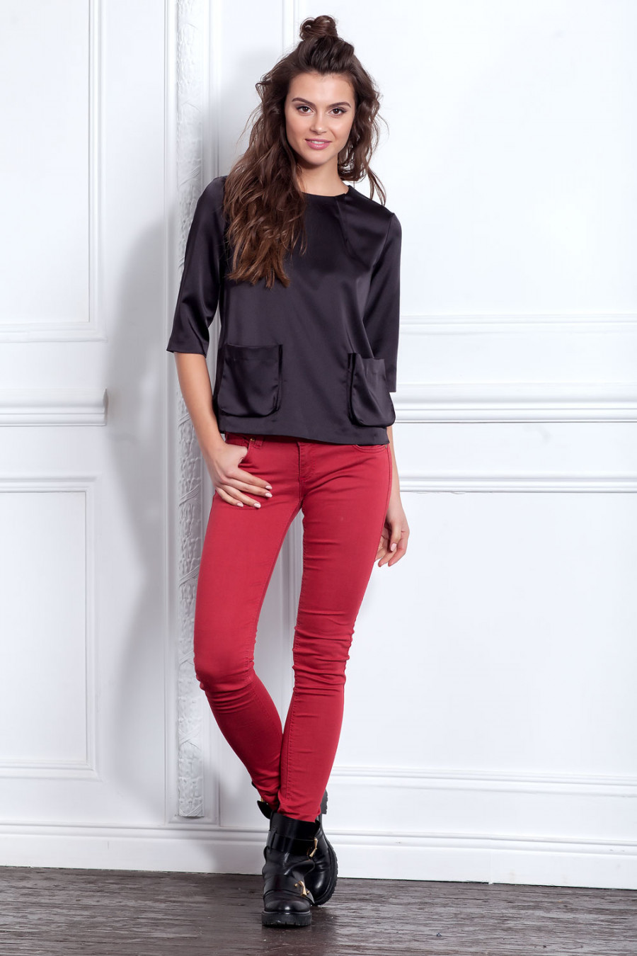 Элегантная и стильная блузка из плотного атласа. Модель свободного кроя с рукавом 3/4. Округлый вырез горловины оформлен вытачками. стачанными "на лицо". Впереди выполнены объемные карманы "портфель". Сзади застежка на металлическую молнию.Изделие прекрасно сочетается с различными видами одежды.