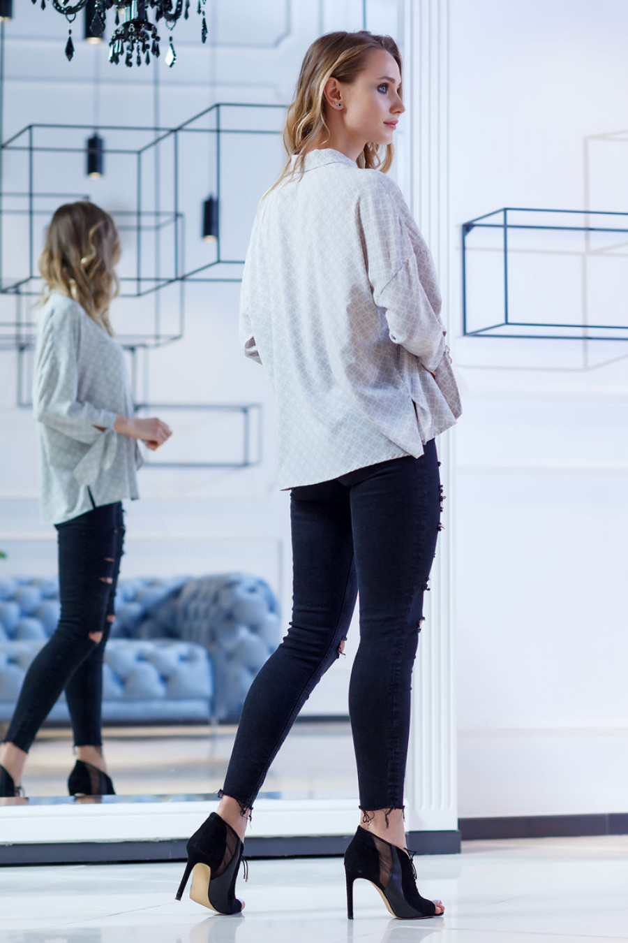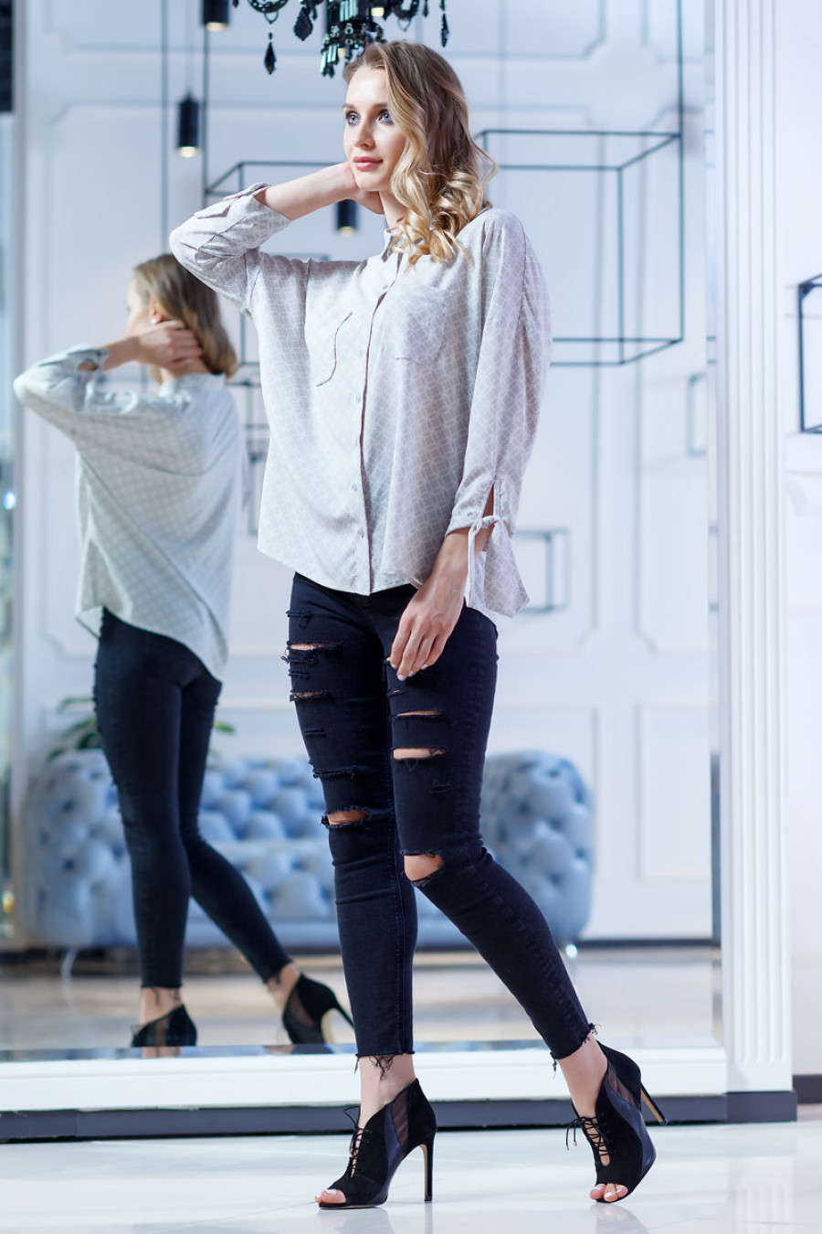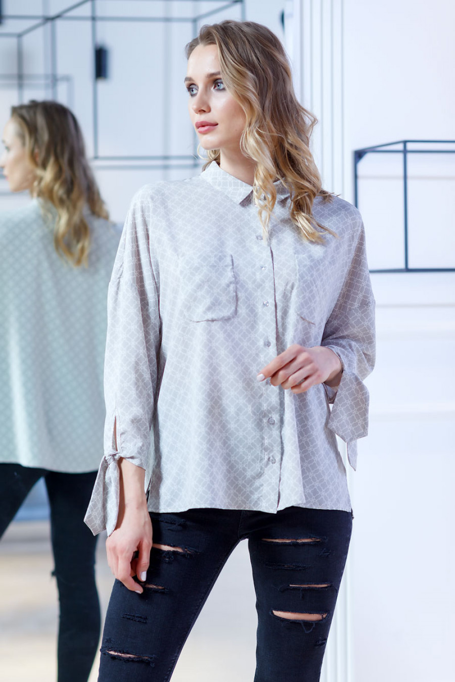 Женственная и элегантная блузка из тонкой ткани с оригинальным принтом. Модель свободного кроя с аккуратным воротничком и карманами впереди. Романтичность образу придают завязывающиеся манжеты на длинных рукавах. Застежка впереди на планку с пуговицами.