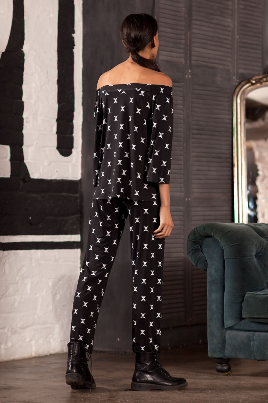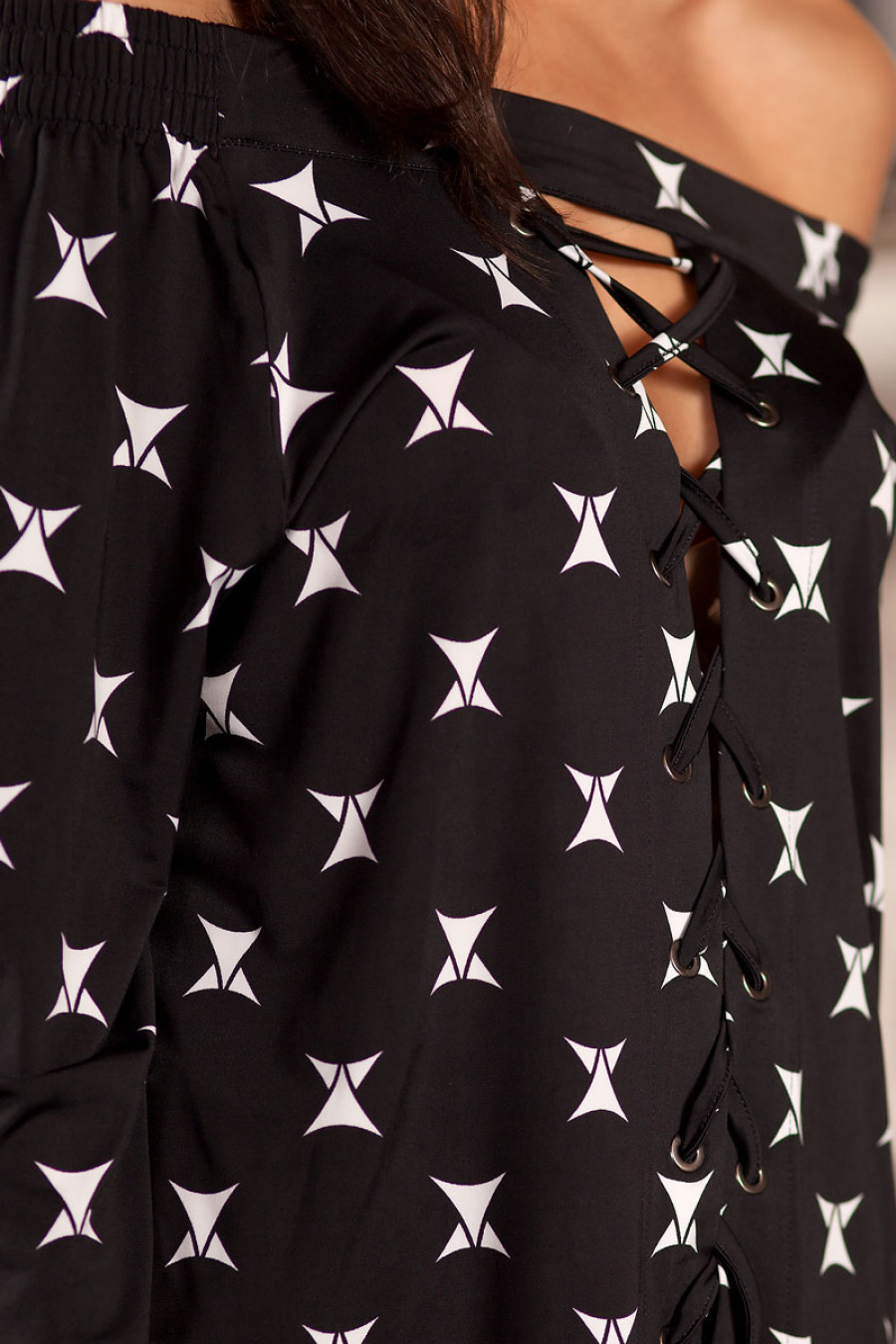 Стильная блуза из пластичного трикотажа с абстрактным рисунком. Модель свободного кроя с рукавом 3/4. Вырез горловины лодочка открывает изящные плечи. Спинка декорированаразрезом со шнуровкой.