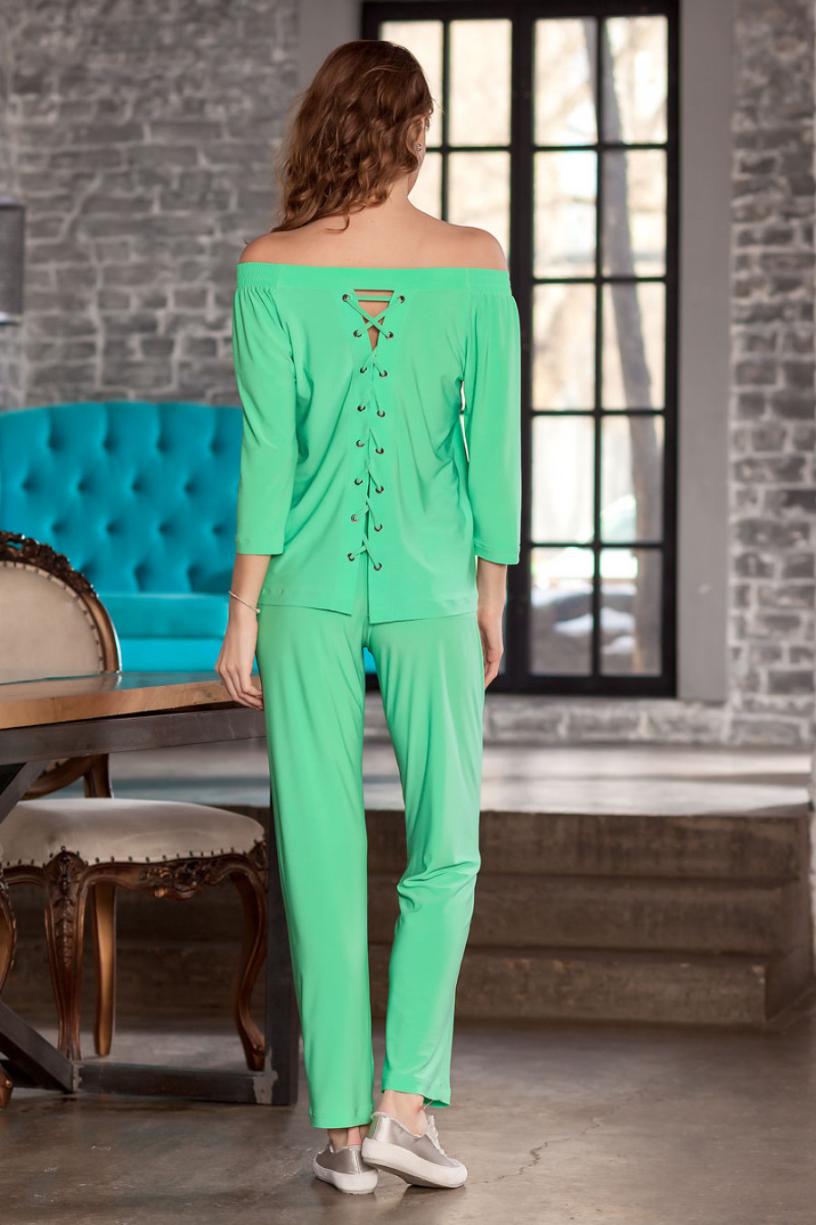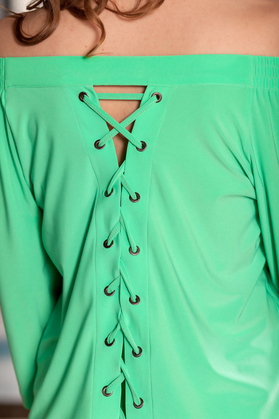 Стильная блуза из пластичного однотонного трикотажа. Модель свободного кроя с рукавом 3/4. Вырез горловины лодочка открывает изящные плечи. Спинка декорированаразрезом со шнуровкой.