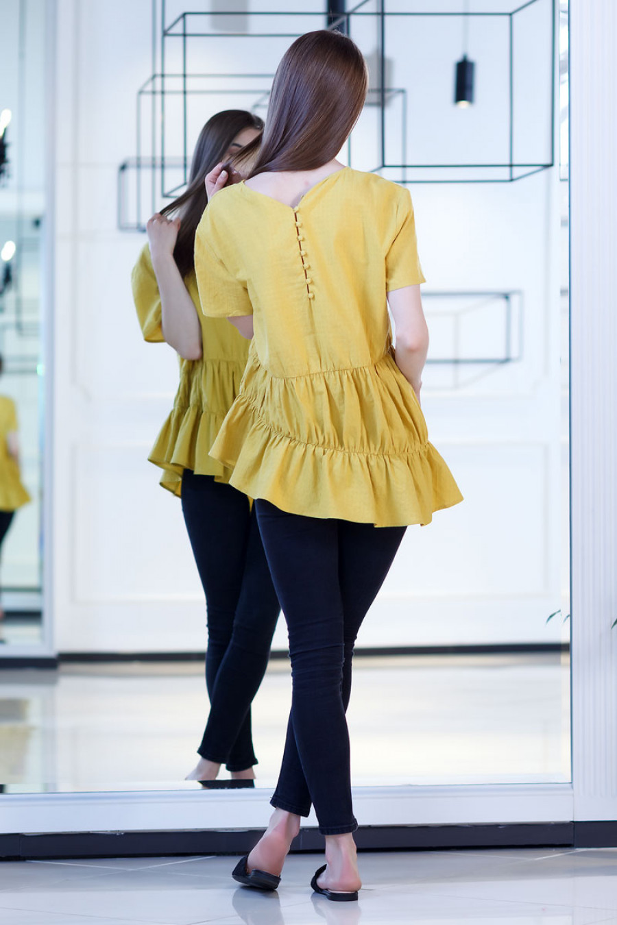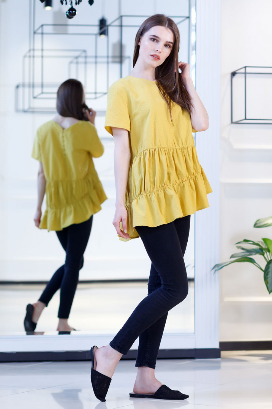 Стильная летняя блуза из хлопка. Модель свободного кроя с коротким рукавом. Оригинальность модели придают вставки со сборкой. Линия низа асимметричная. Сзади застежка на ряд мелких пуговиц.
