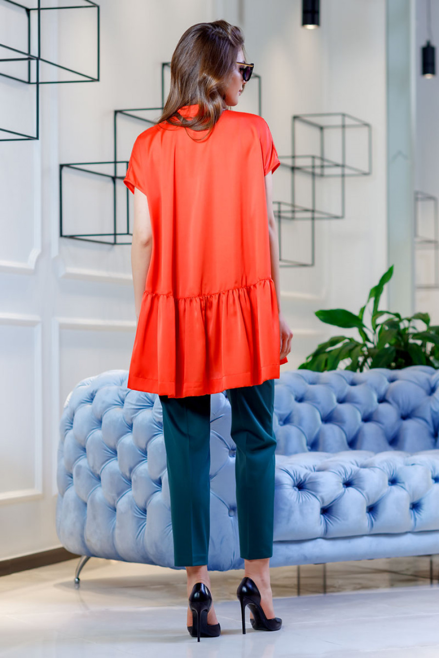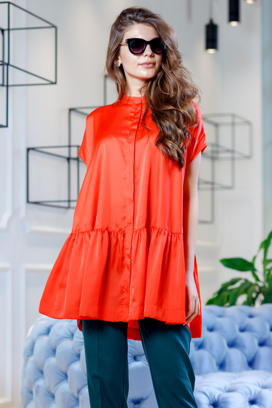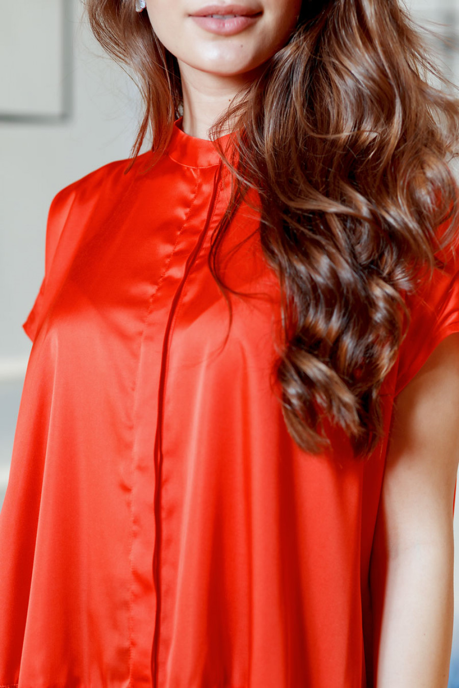 Оригинальная блуза из легкого сатина. Модель оверсайз с коротким рукавом. Горловина оформлена аккуратной стойкой. Впереди потайная застежка на пуговицы.