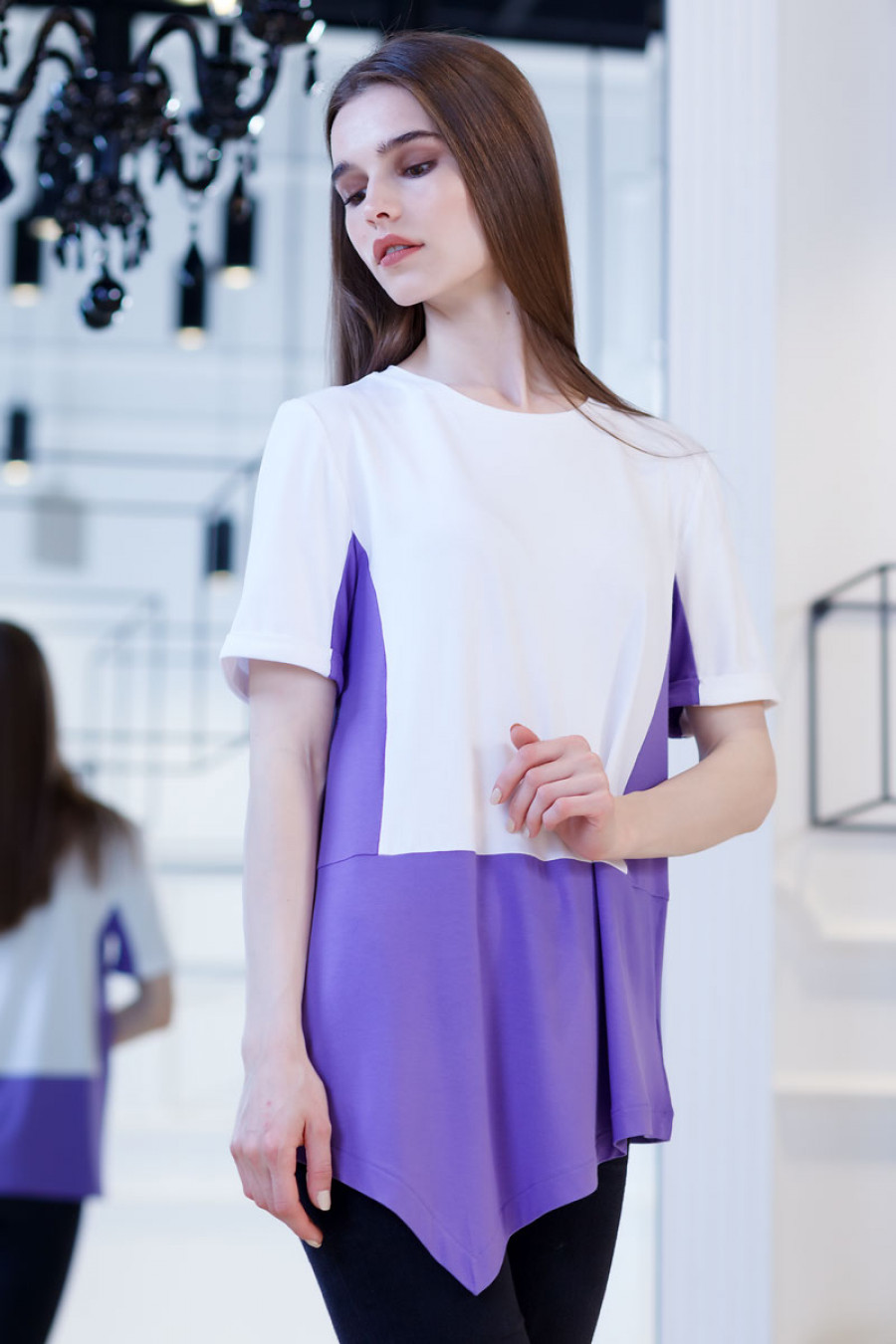 Стильная трикотажная блуза выполнена в сочетании двух цветов. Модель свободного кроя с асимметричной линией низа. Рукав короткий с манжетом. Горловина обработана планкой.