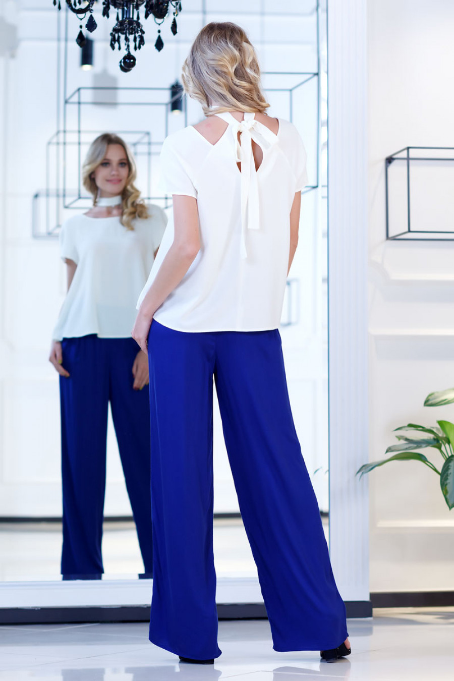 Элегантная блуза из приятного однотонного крепа. Модель свободного кроя с коротким рукавом. Воротник-стойка, имитирующий чокер, сзади завязывается бантом.