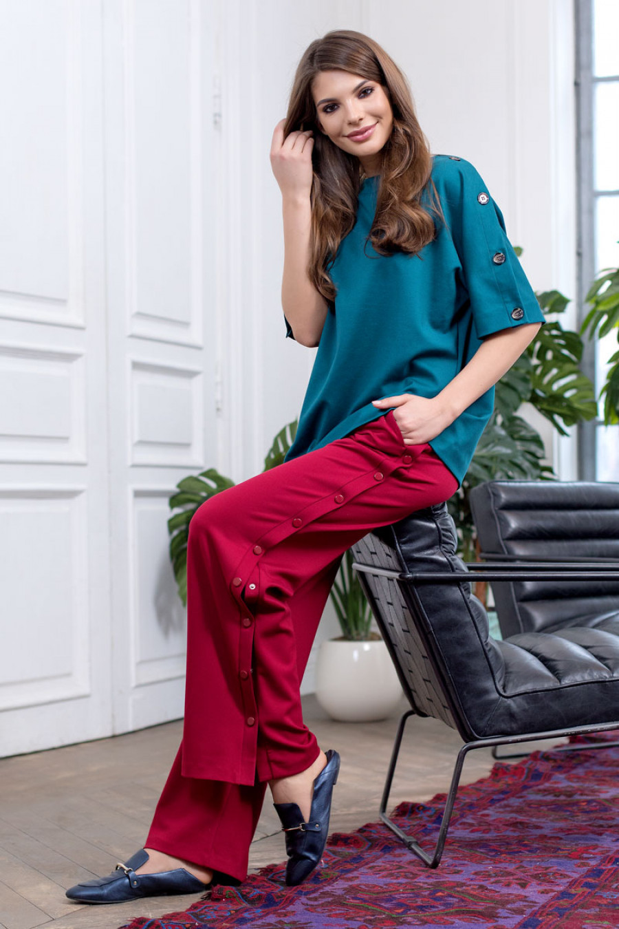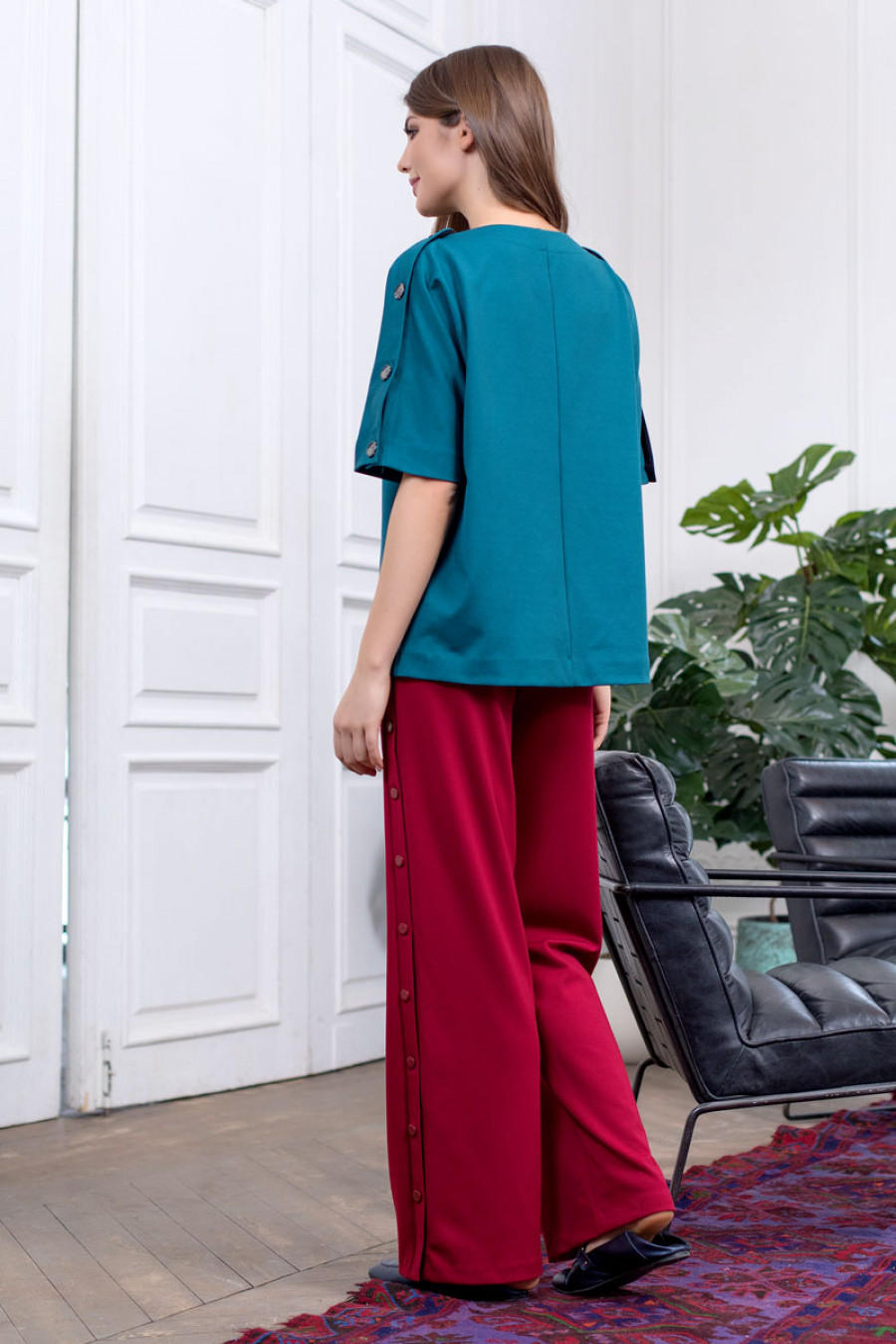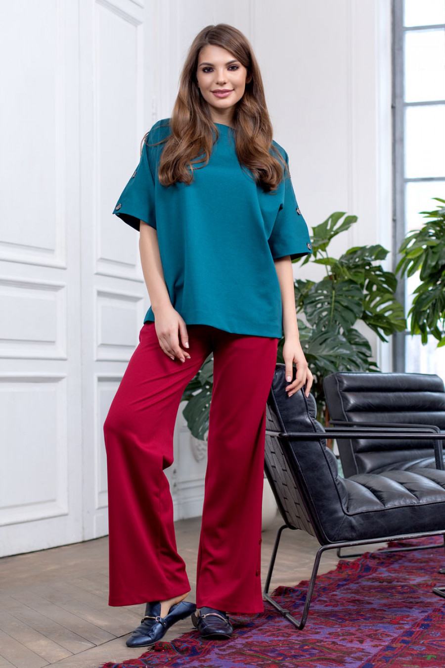 Оригинальная блуза из плотного трикотажа с цельнокроеным рукавом до локтя. Модель свободного кроя с застежкой на пуговицы по плечевым швам. Блуза отлично сочетается с различными видами брюк и юбок.