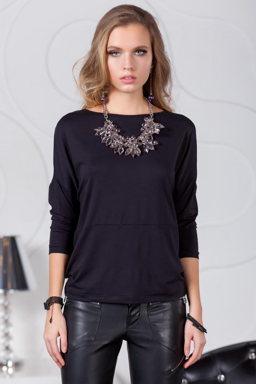 Оригинальная блузка объемного кроя с втачным рукавом 3/4. Модель выполнена из трикотажной вискозы.