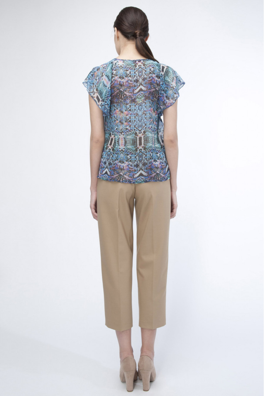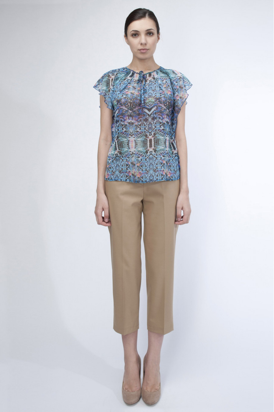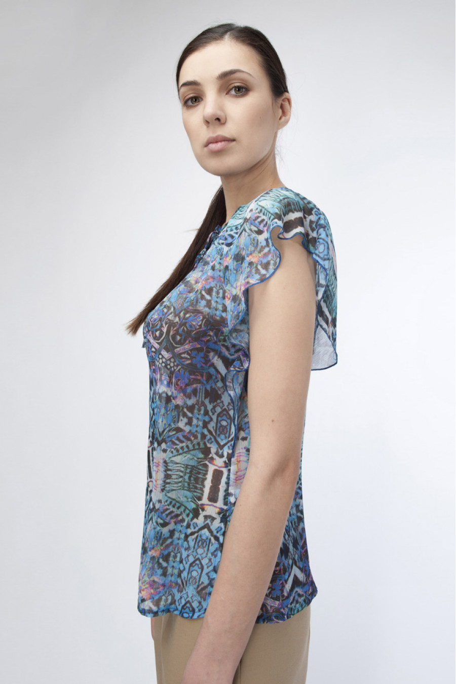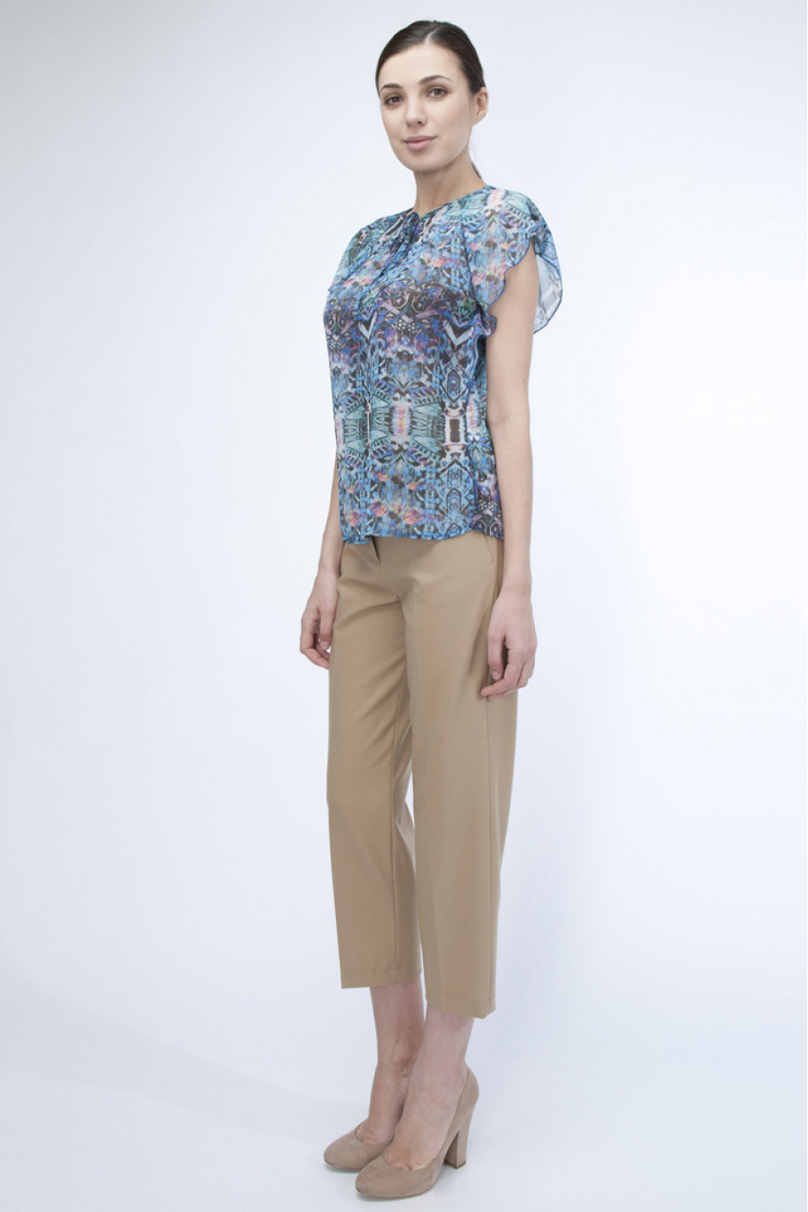 Перед Вами восхитительная модель синей блузки с оригинальным узором. Приятный состав ткани. Нет рукавов, отличный вариант для лета. Выточки по линии спинки. Приталенный силуэт. Свободный крой. Овальный вырез.