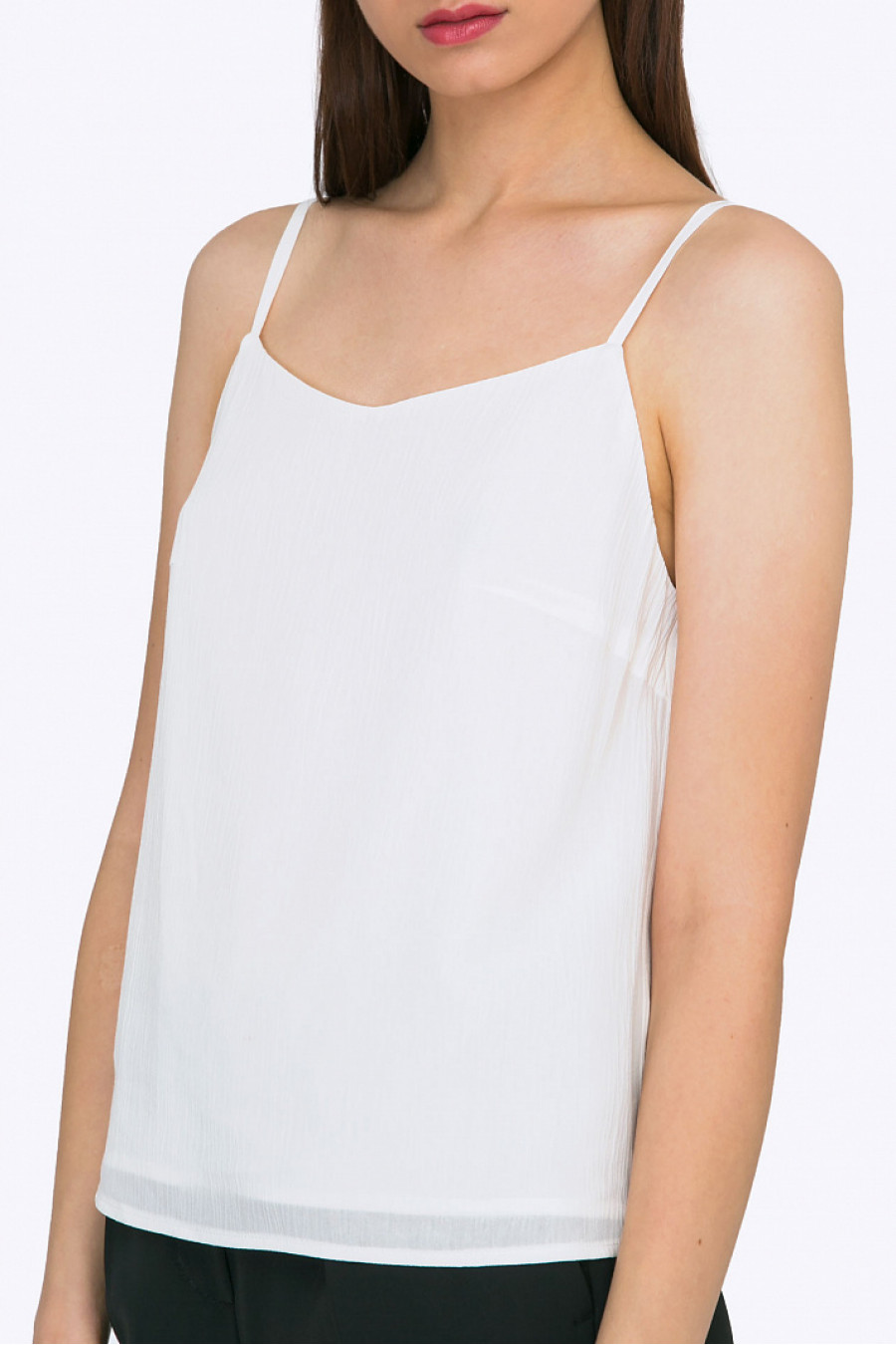 Топ на бретельках. Модель хорошо сидит по фигуре. Такая вещь способна разбавить даже очень строгие наряды. Данная модель отлично сочетается с юбками карандаш и однотонными брюками. При желании топ можно надеть в офис, если накинуть сверху лаконичный пиджак на одну пуговицу. Образ на фото дополнен Брюками D055-carlota.