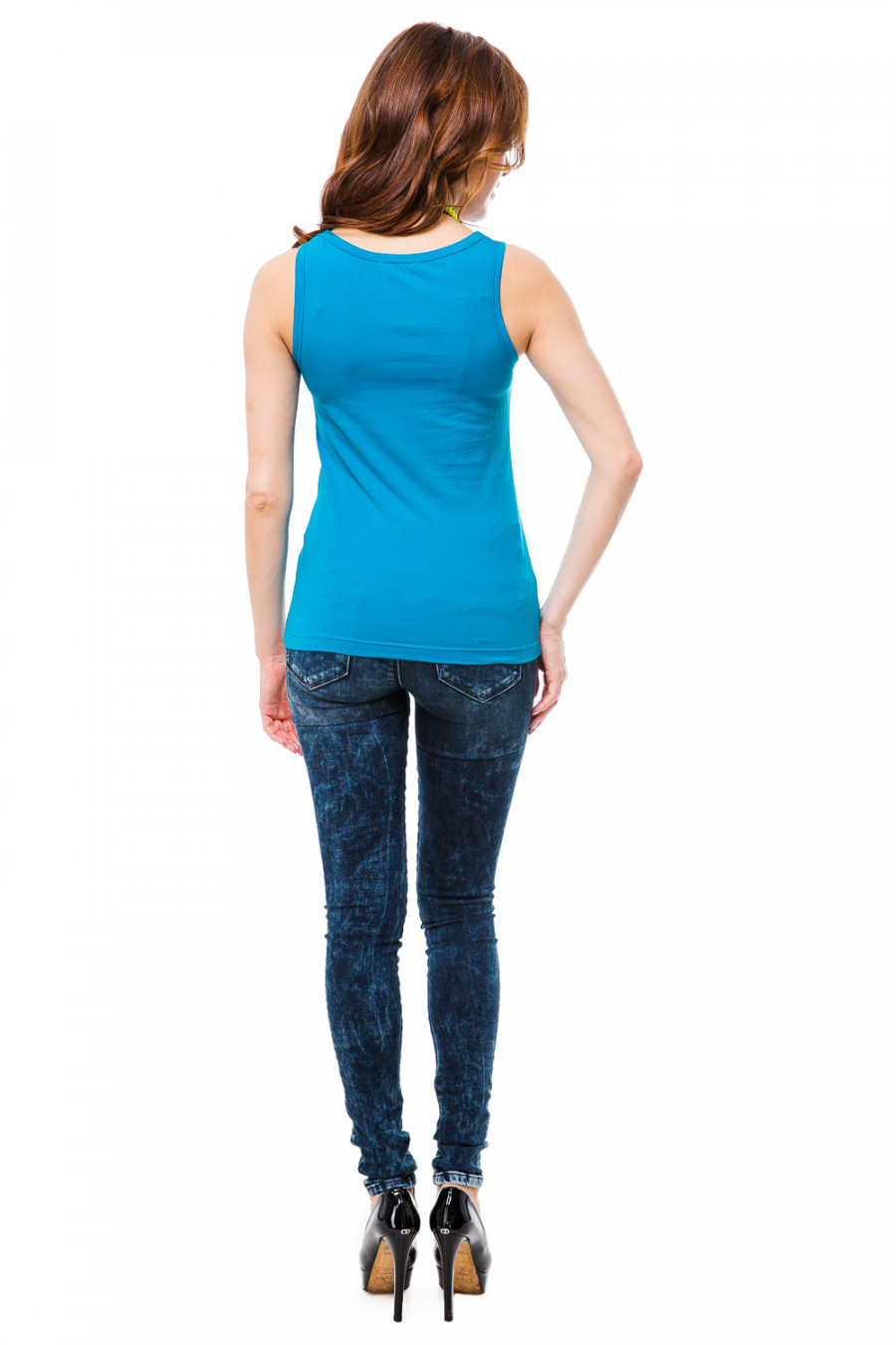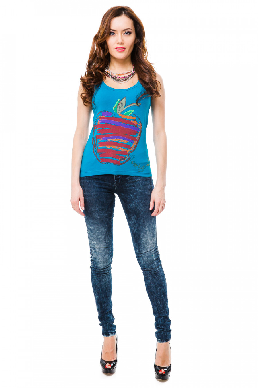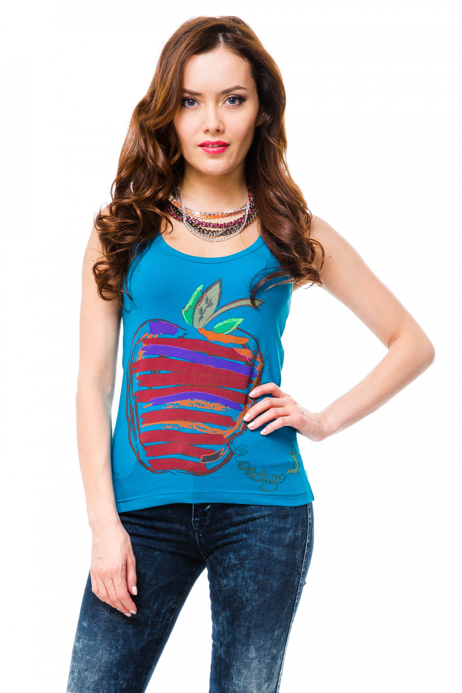 Стильная яркая топ-майка на широких бретелях. Передняя часть модели украшена принтом.