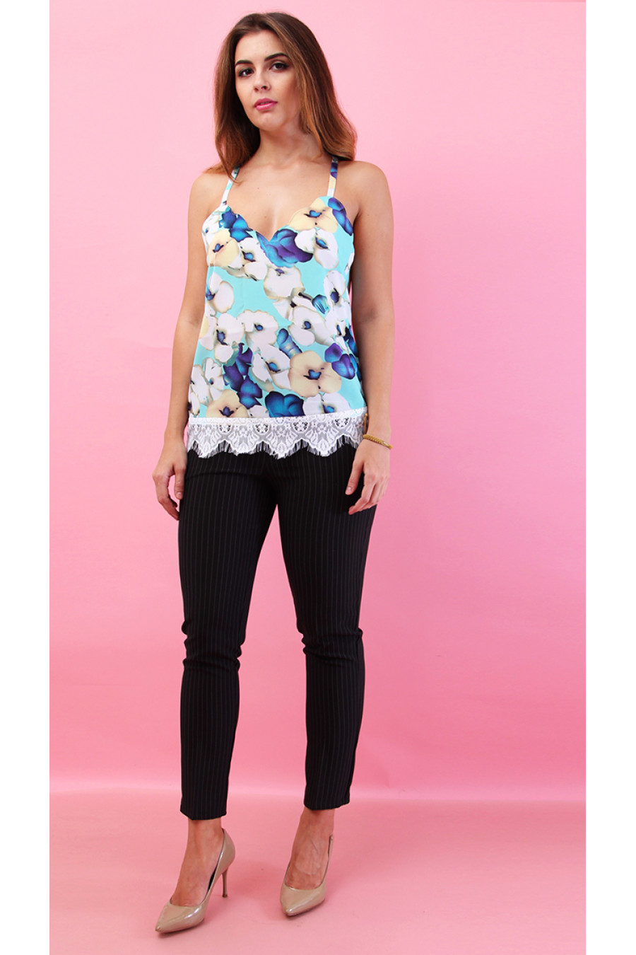Элегантный топ на тонких бретелях, по низу декорирована черным кружевом, V-образный глубокий вырез