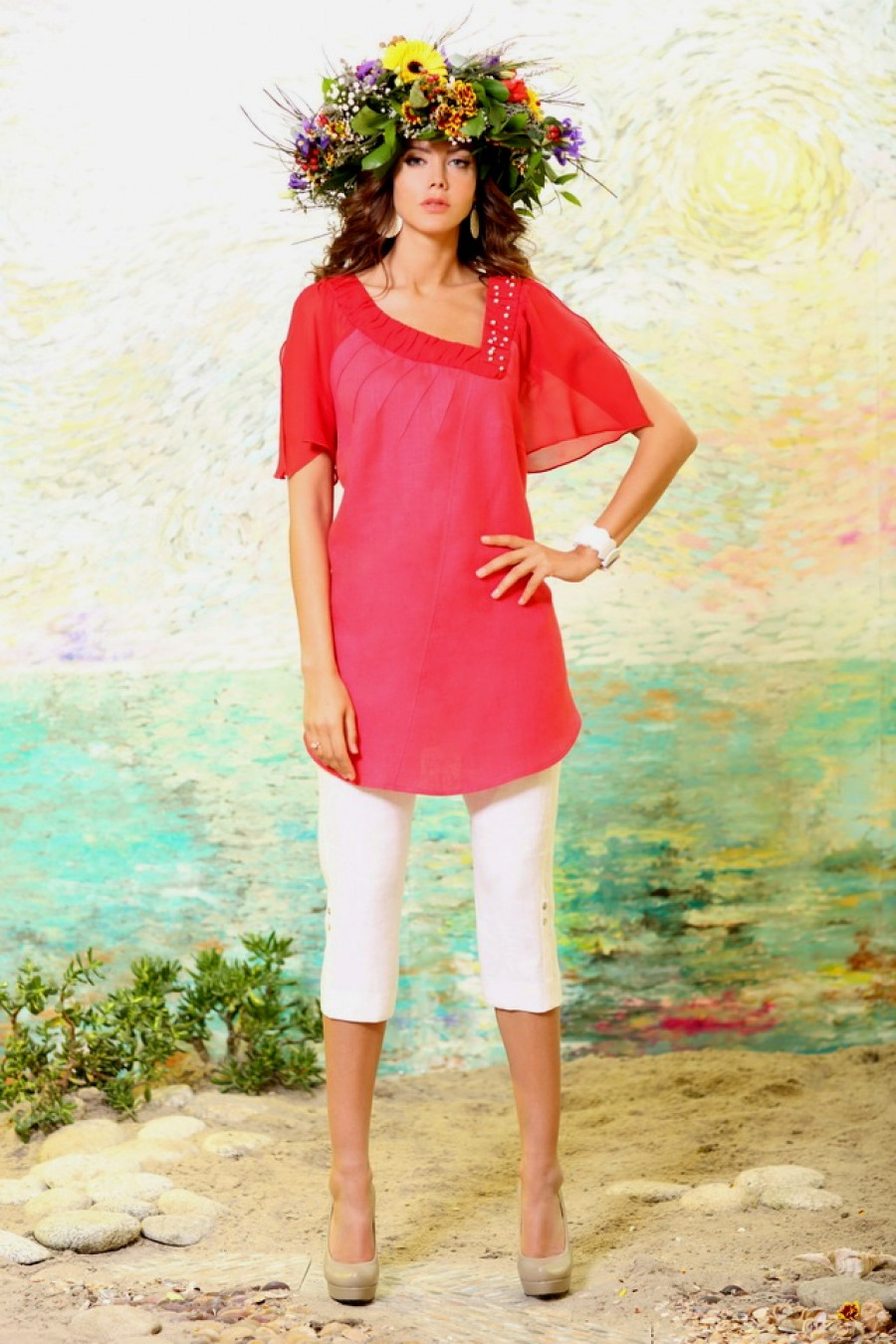 Изысканная женская туника выполнена на сочетании двух тканей: лёгкого шифона и натурального льна. Лёгкий рукав выполнен из шифона. Горловина туники обработана шифоном и декорирована стразами. Такой фасон необычайно удобен тем, что не стесняет движений и подходит практически к любому типу фигуры