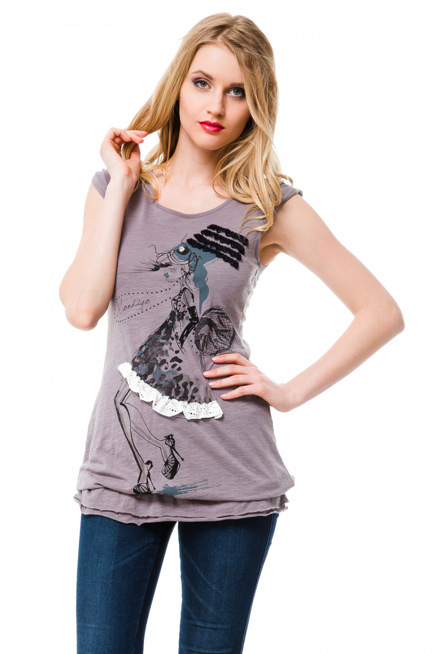 Стильная туника подарит роскошный образ любой девушке. Оформлена рисунком и дизайнерскими вставками из ткани и страз . Низ изделия украшен воланами в два слоя и обработан лазерным методом.