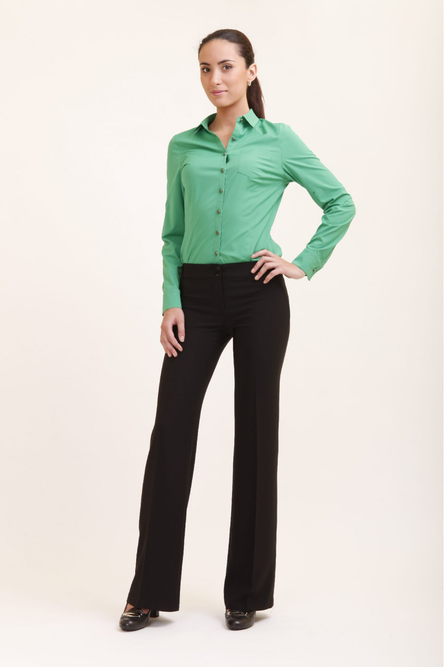 Брюки молодежные, универсальные, расширенные от линии колена, на притачном поясе. На заднем полотне притачная кокетка с клапанами и рамка имитирующая карман. На полотнах брюк заутюжены стрелы.