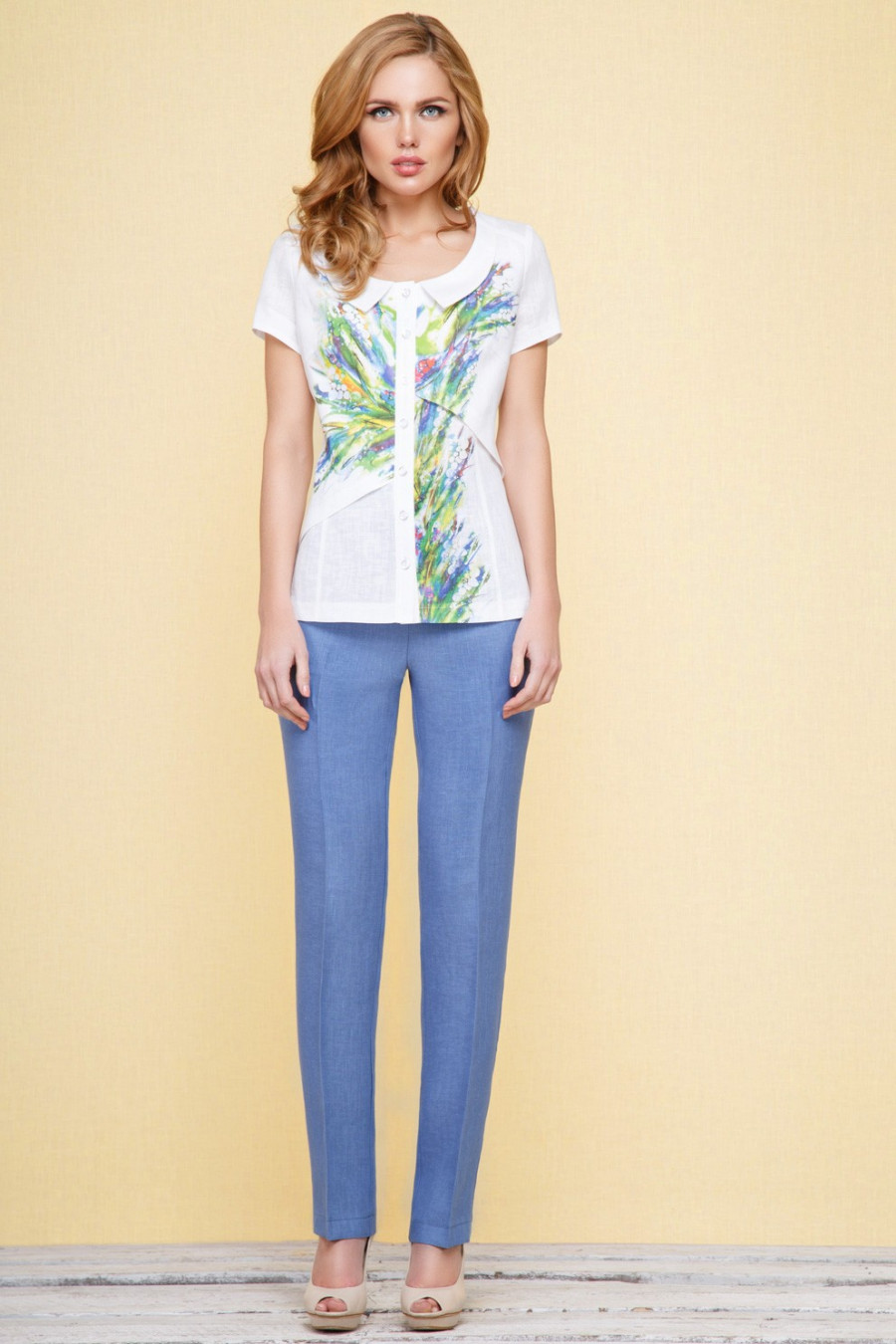 Брюки женские, ArtRibbon, полуприлегающего силуэта из льняной ткани. По переду обработаны фигурные боковые карманы, в среднем шве - застежка на усиленную тесьму "молния" и петли и пуговицы на кокетке. По спинке обработаны талевые вытачки и прорезные карманы с двумя обтачками. Верхний срез брюк обработан притачными кокетками и обтачками. Брюки с заутюженными "стрелками".