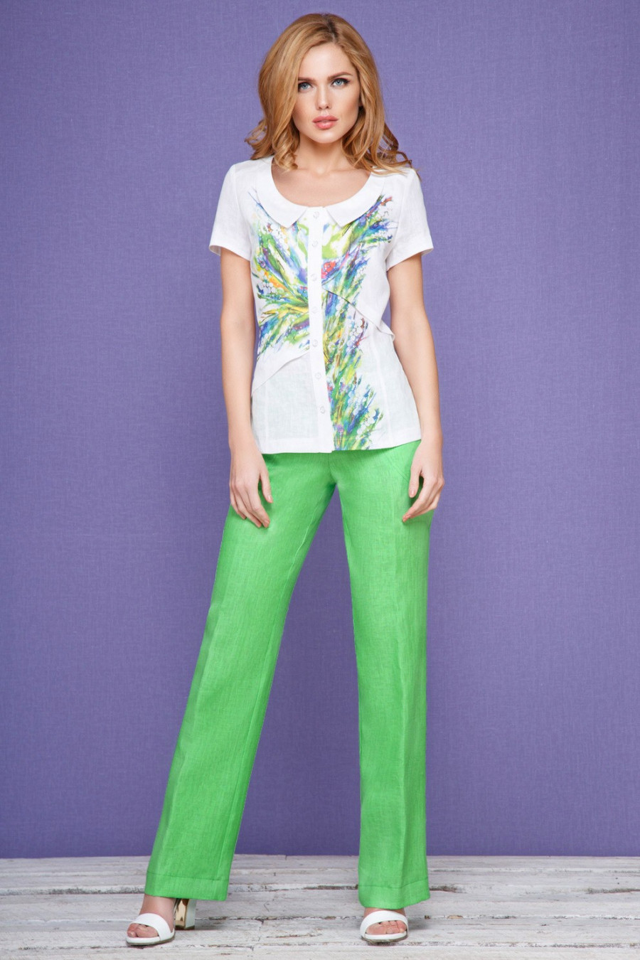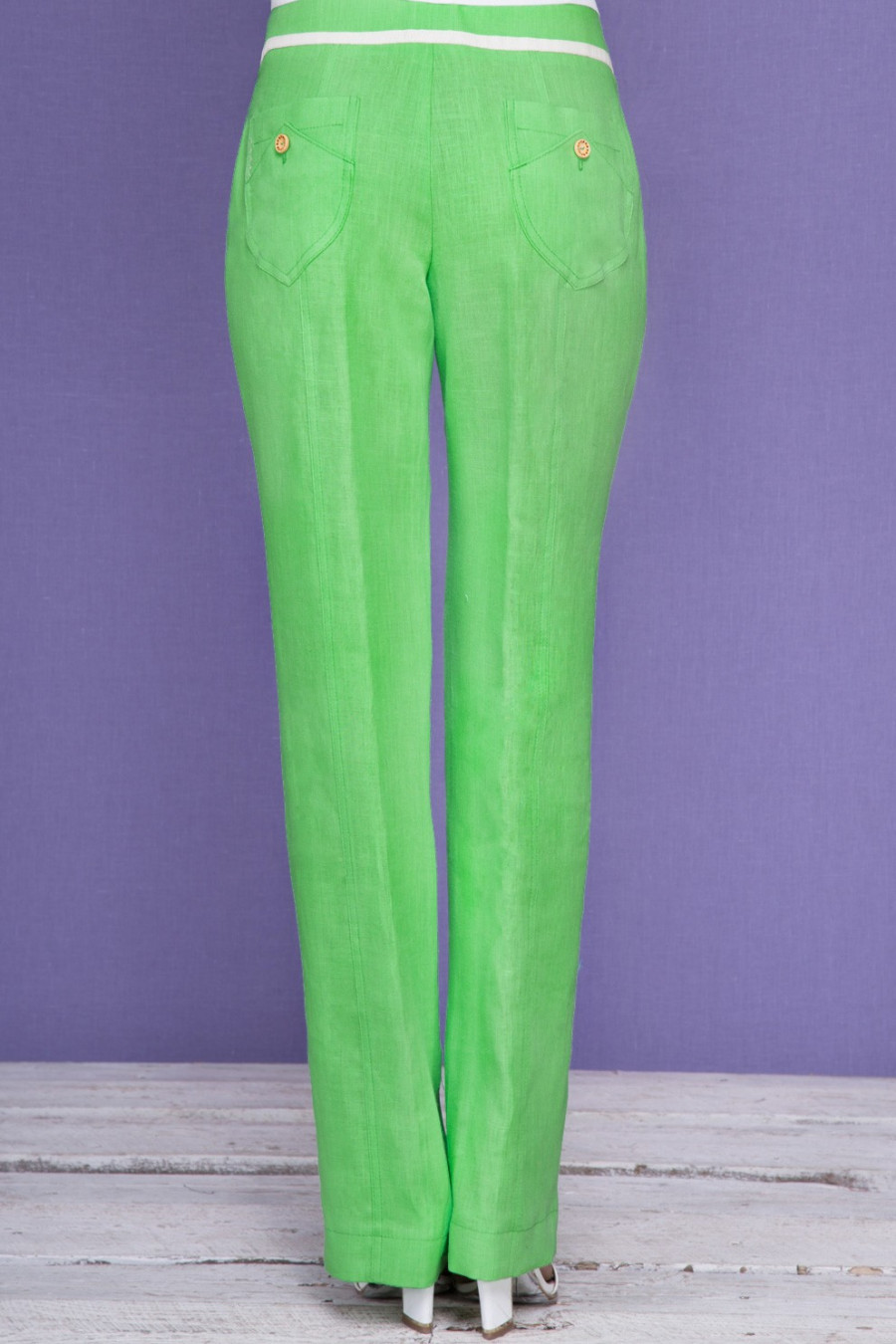Брюки женские, ArtRibbon, полуприлегающего силуэта из льняной ткани. По переду обработаны боковые карманы, в среднем шве застежка на усиленную тесьму "молния". По спинке обработаны фигурные накладные карманы, рельефные швы. Верхний срез обработан притачными кокетками и обтачками.