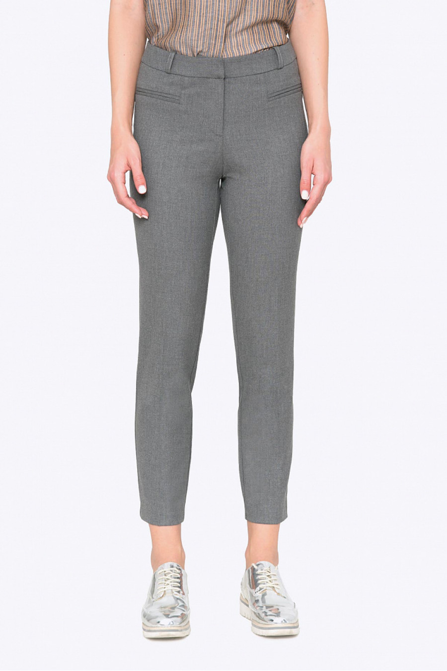 Брюки со средней посадкойслегка зауженные книзу. Ткань эластичная, приятная к телу. Модель по бокам оформлена карманами-обманками. Отличная модель на каждый день, и для офиса. Хорошо сидит по фигуре. Рост фотомодели 176см.