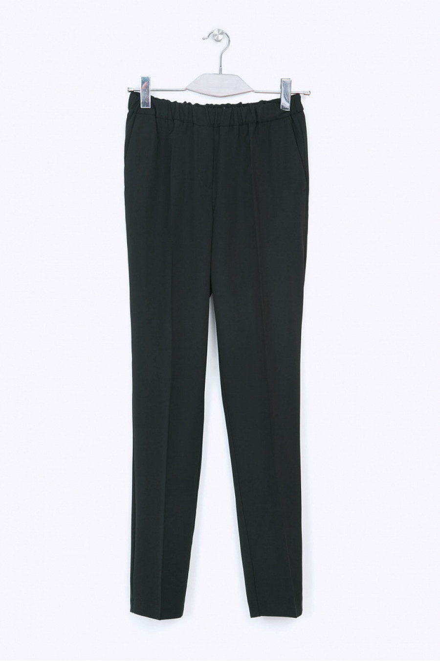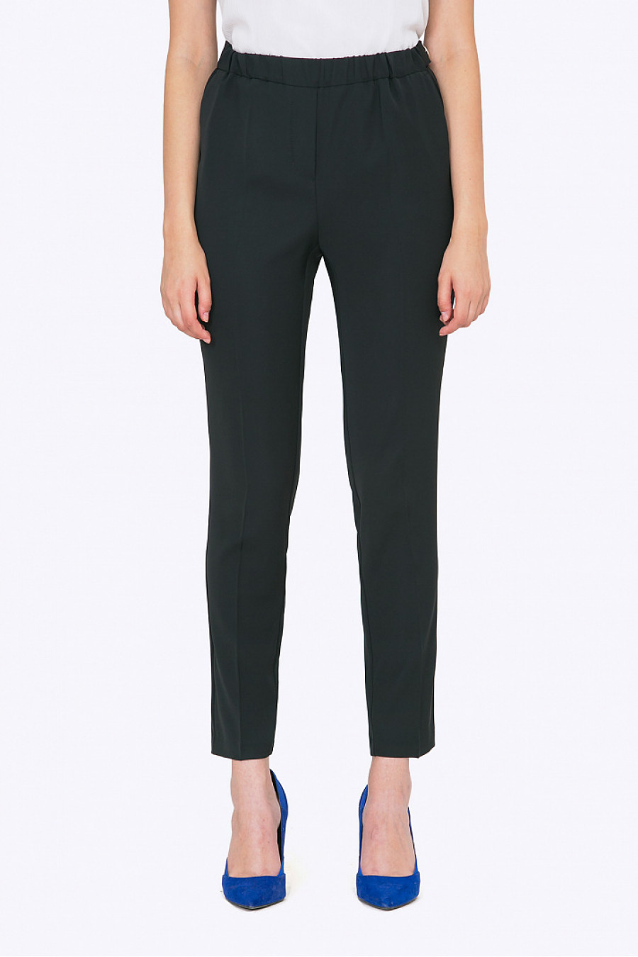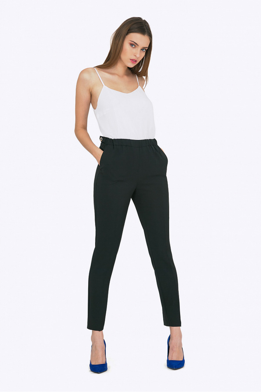Брюки на резинке, слегка зауженные к низу. Ткань струящаяся черного цвета. Модель с карманами. Брюки хорошо сидят по фигуре, прекрасно дополнят вечерний образ. Рост фотомодели 176 см.