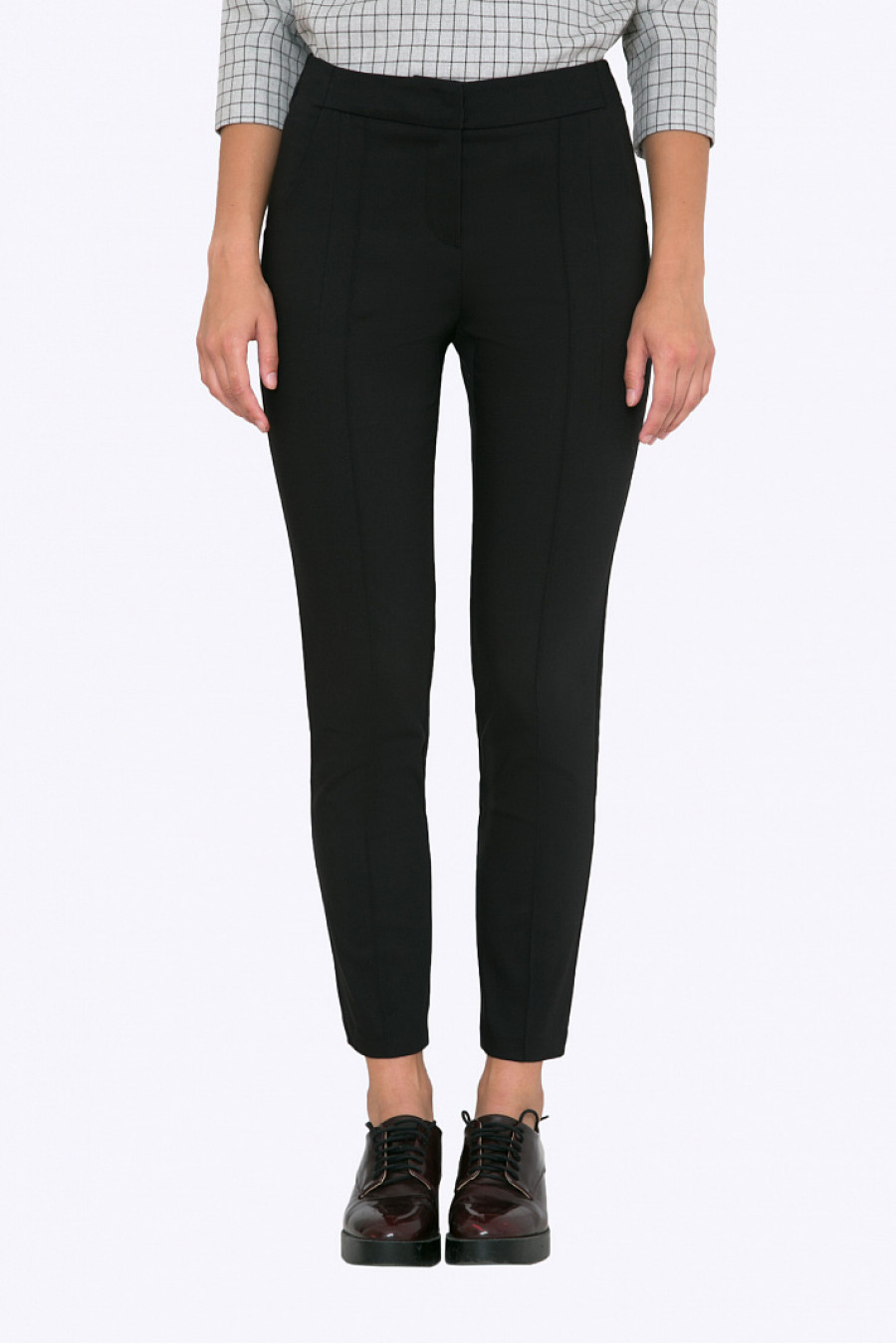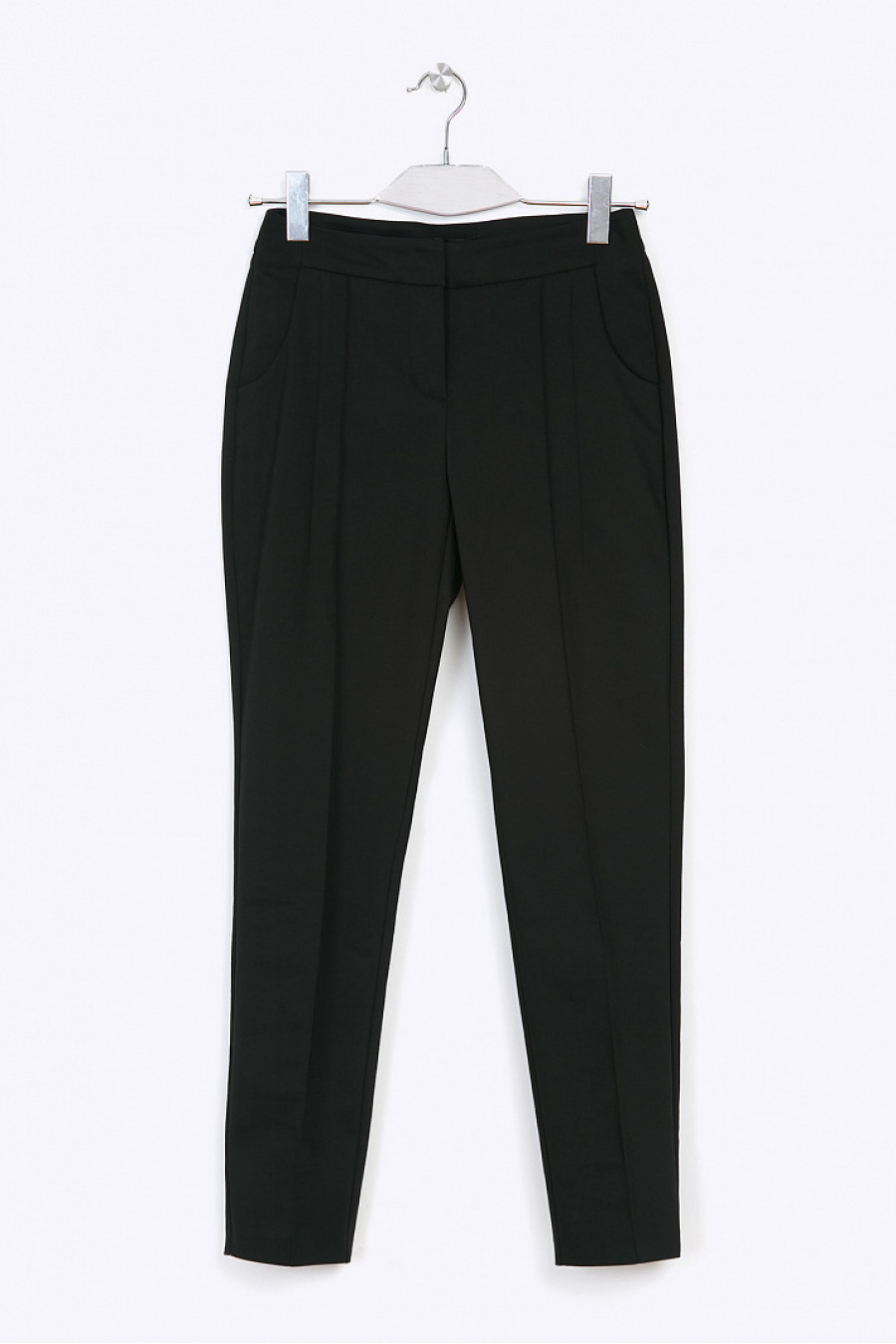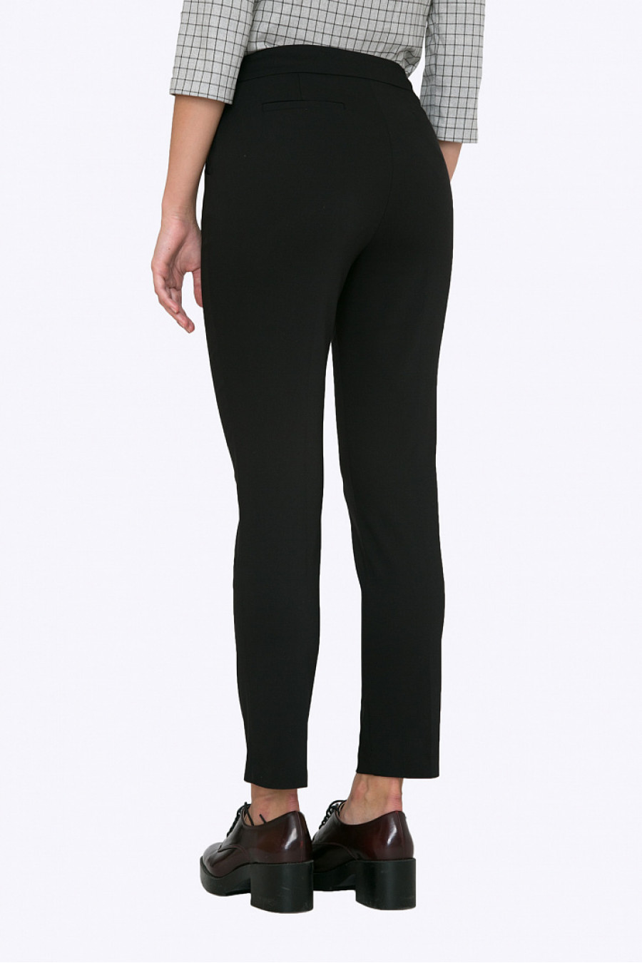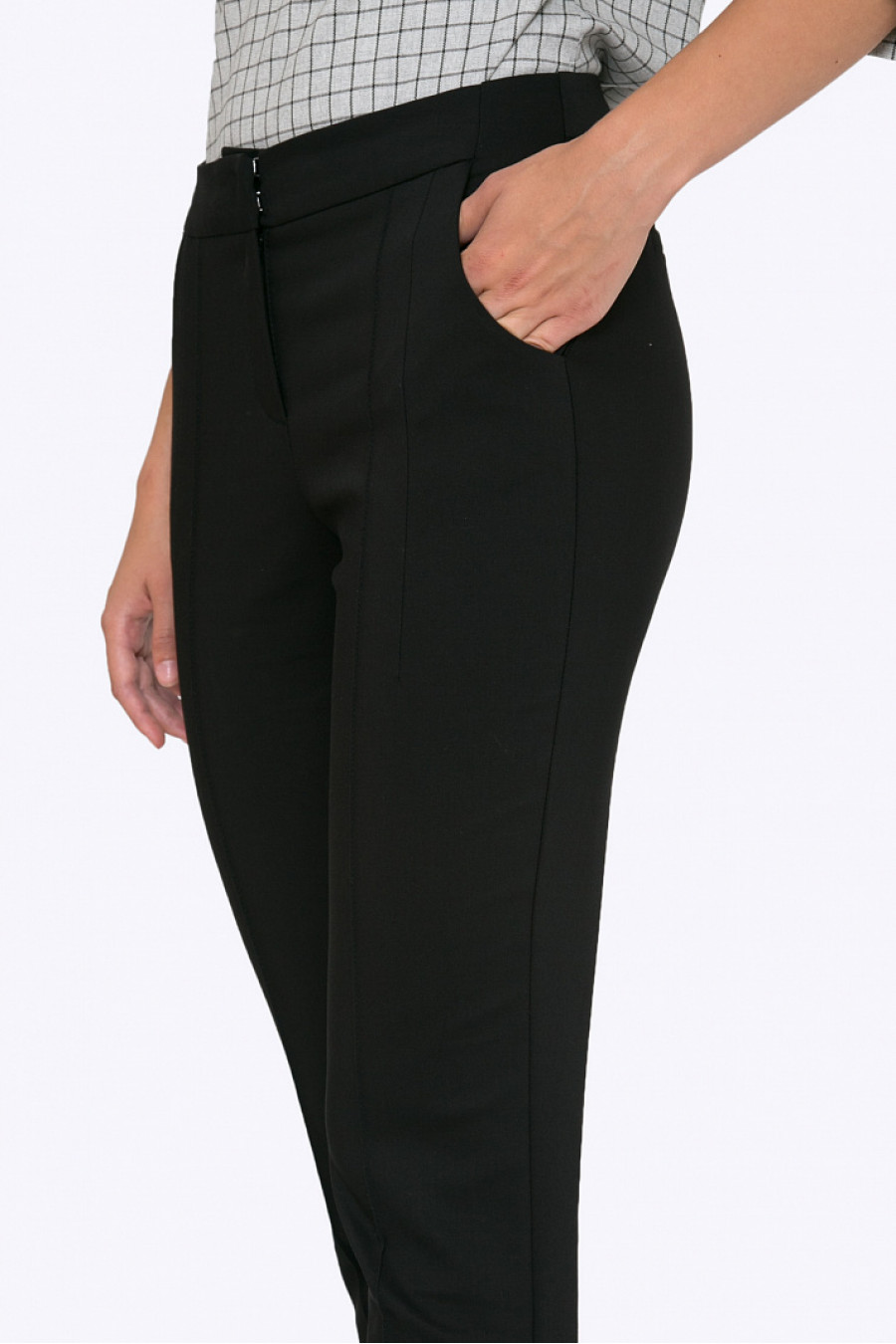 Брюки со средней посадкой слегка зауженные к низу. Ткань эластичная, плотная черного цвета. По бокам есть карманы. Стильные брюки на каждый день и для офиса. Рост фотомодели 175см.
