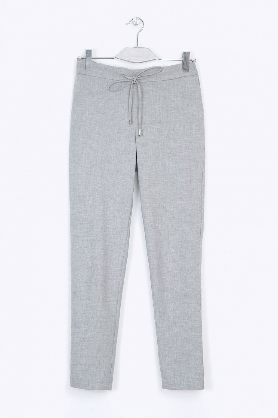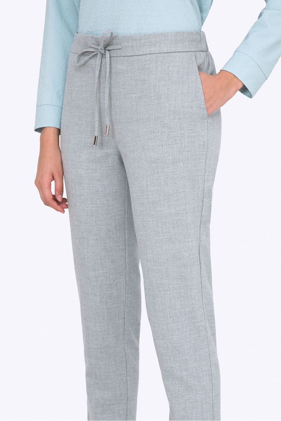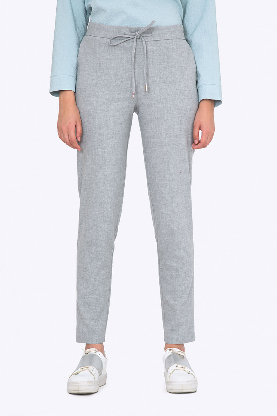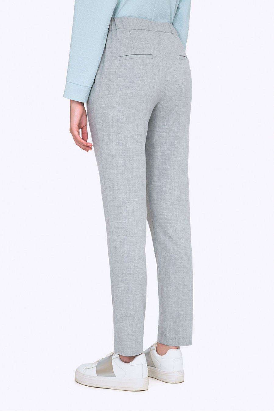 Брюки с резинкой слегка зауженные к низу. Ткань мягкая. По бокам есть карманы. Модели на резинке не уступают по универсальности своим конкурентам с молнией. Брюки можно сочетать с блузками, укороченными пиджаками с базовым топом. Такой образ будет комфортным и стильным.