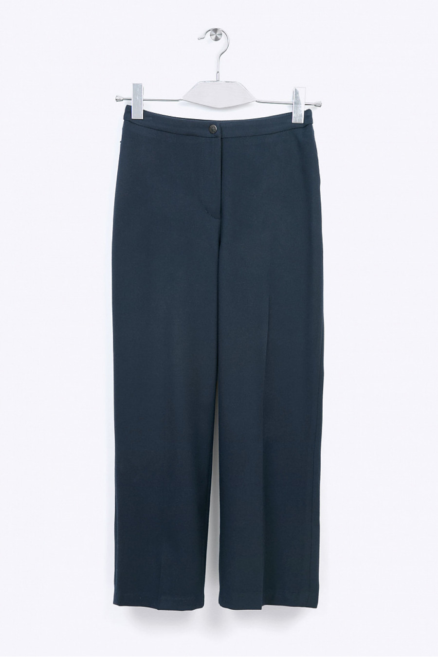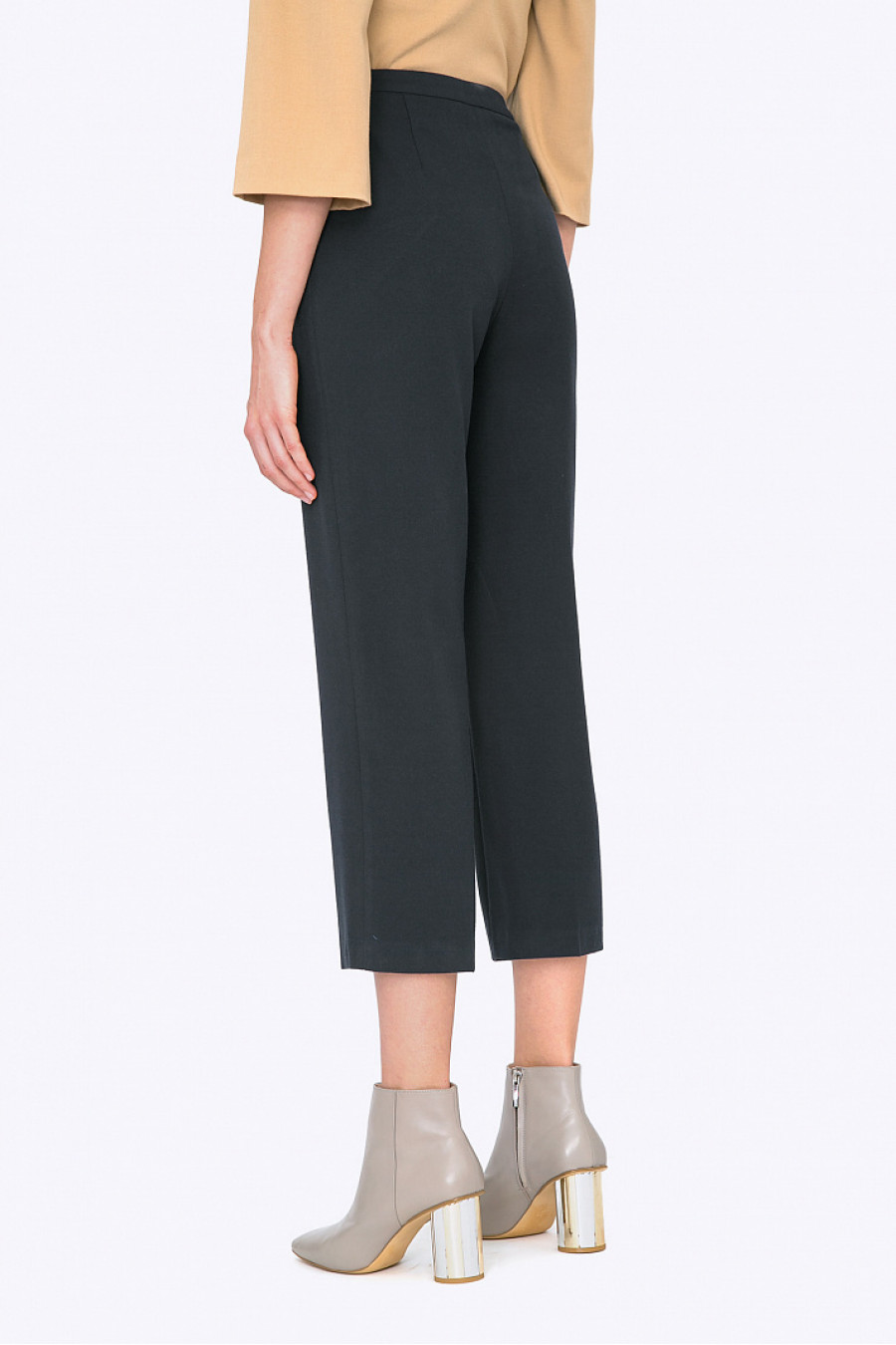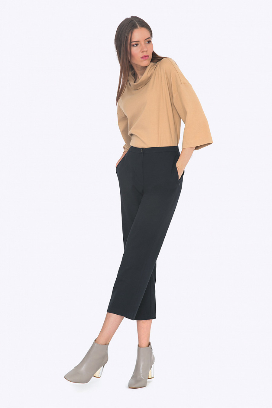 Брюки-кюлоты с карманами на молнии. Ткань мягкая темно-синего цвета.Эта модная новинка как нельзя лучше подойдет девушкам стипами фигуры «песочные часы» и «перевернутый треугольник». Брюки прекрасно будут смотреться в повседневном образе или деловом луке. Рост фотомодели 178см.